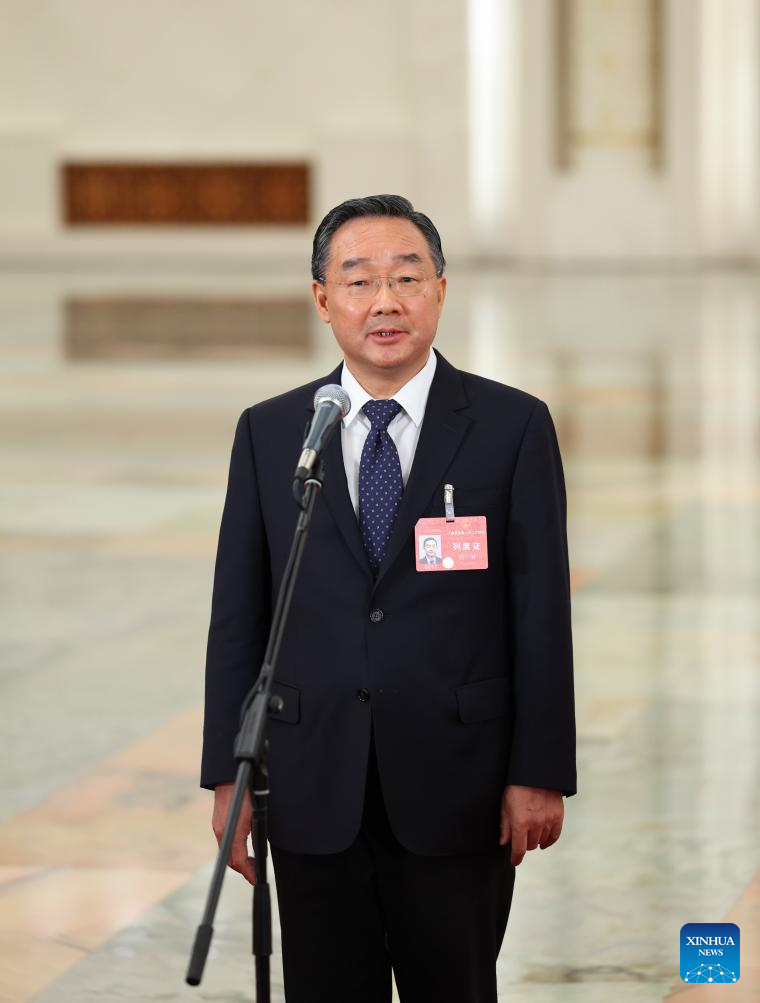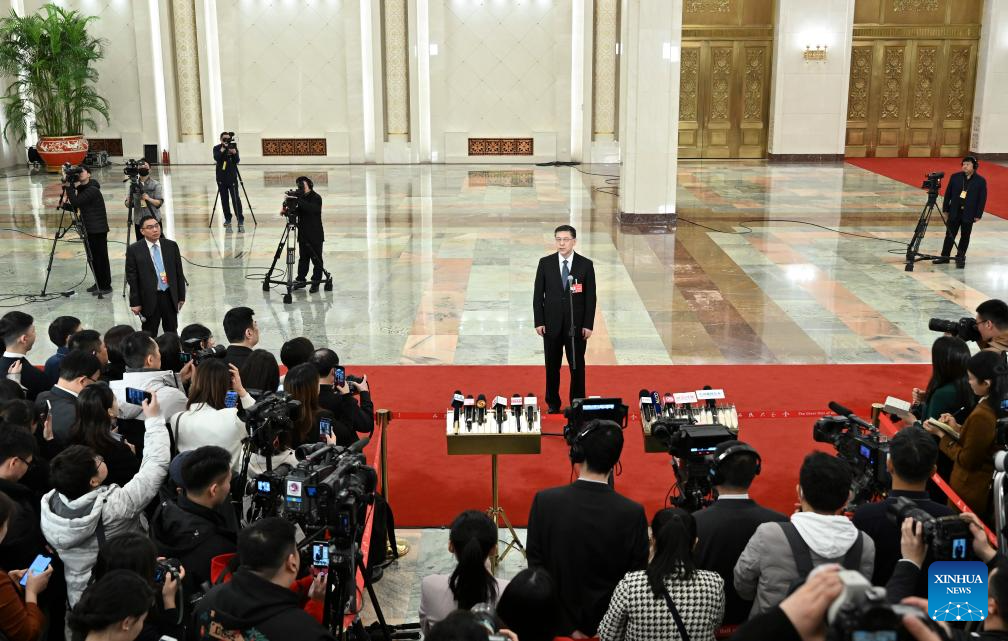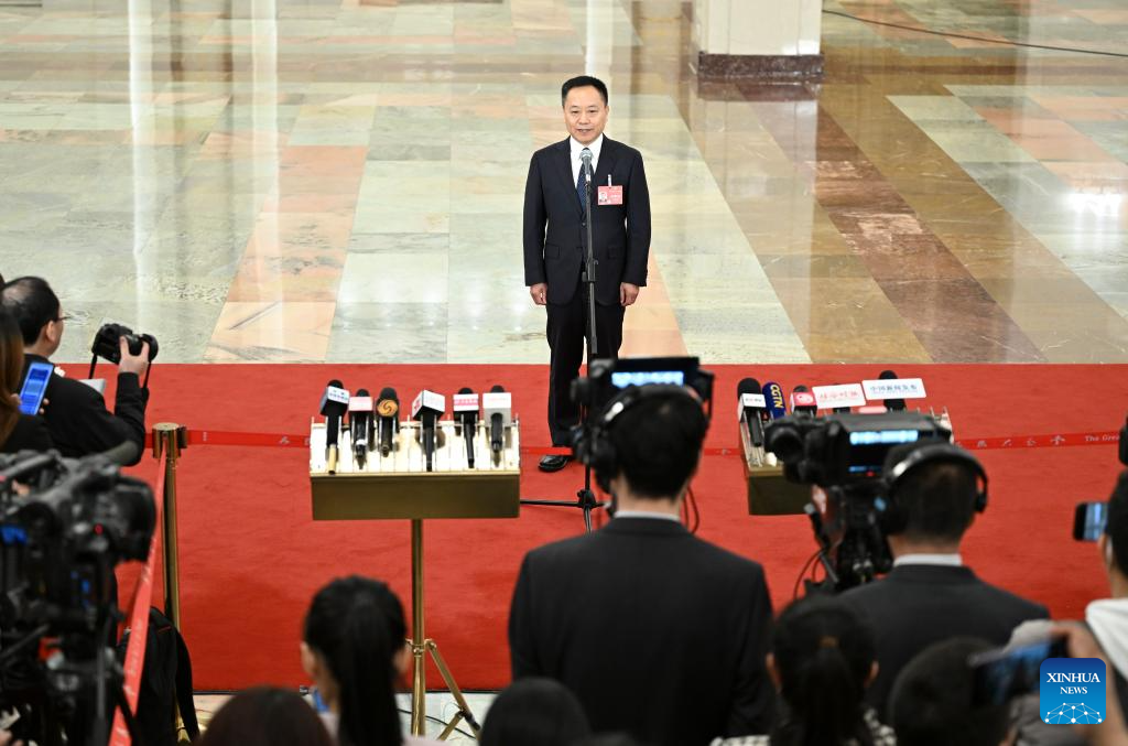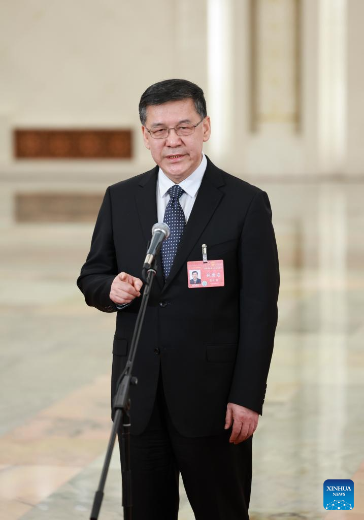 Chinese Minister of Science and Technology Yin Hejun gives an interview after the opening meeting of the second session of the 14th National People's Congress (NPC) at the Great Hall of the People in Beijing, capital of China, March 5, 2024. (Xinhua/Mu Yu)