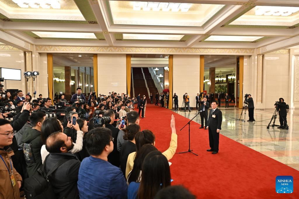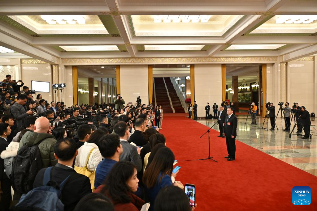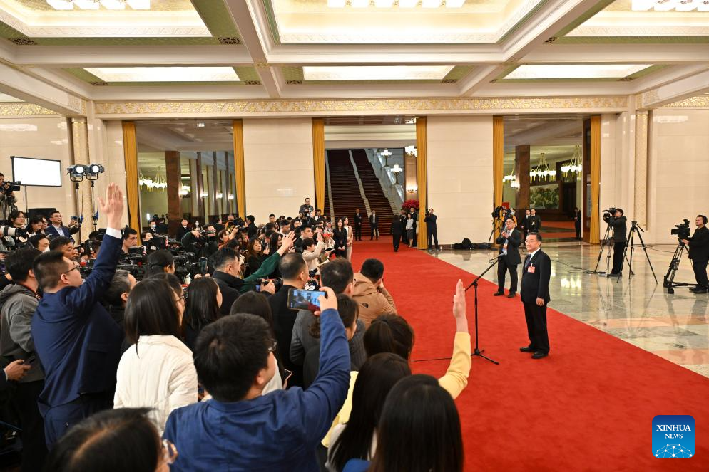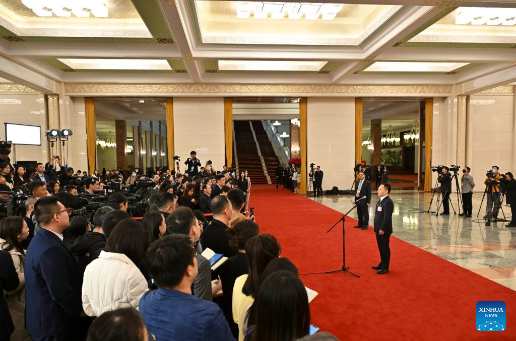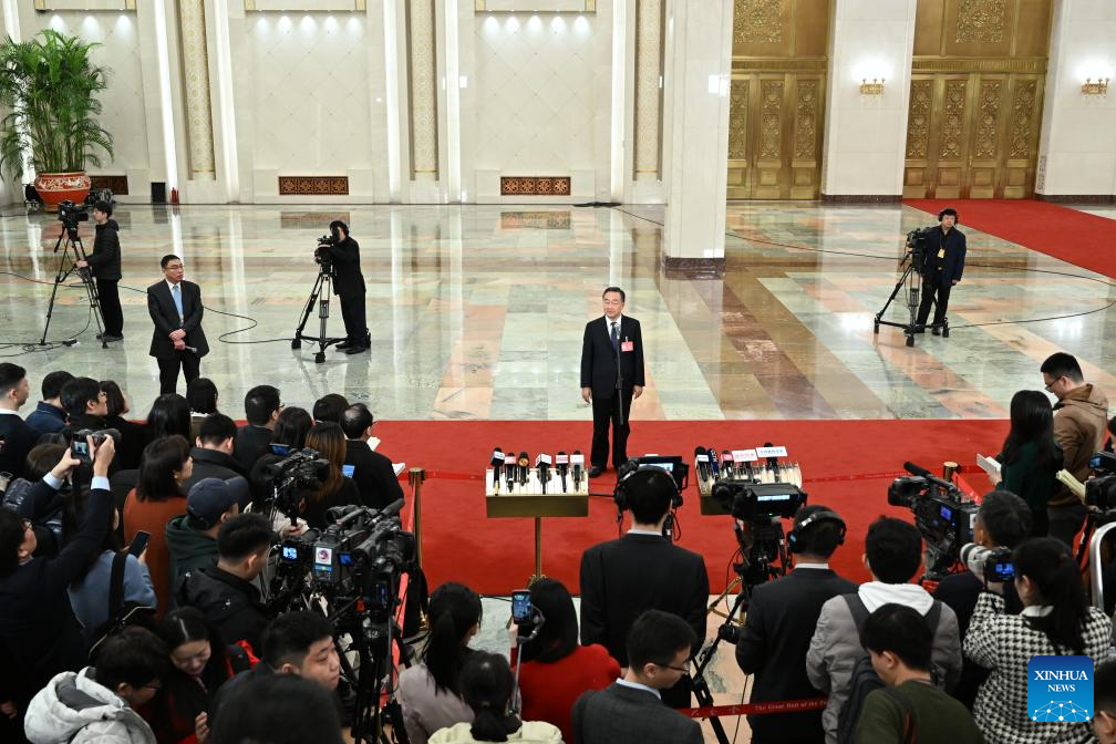 Chinese Minister of Water Resources Li Guoying gives an interview after the opening meeting of the second session of the 14th National People's Congress (NPC) at the Great Hall of the People in Beijing, capital of China, March 5, 2024. (Xinhua/Li Xin)
