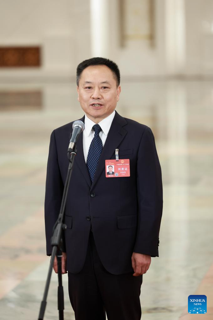 Chinese Minister of Water Resources Li Guoying gives an interview after the opening meeting of the second session of the 14th National People's Congress (NPC) at the Great Hall of the People in Beijing, capital of China, March 5, 2024. (Xinhua/Liu Xu)