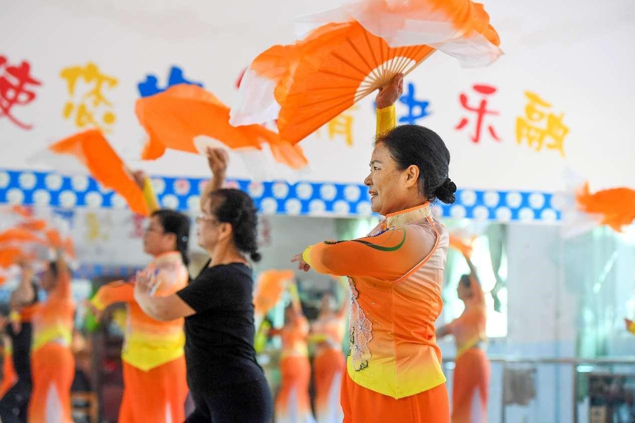 Senior citizens attend a dancing class offered by an "elderly college" in Shangtang township, Fengcheng, east China's Jiangxi province. (People's Daily Online/Zhou Liang)
