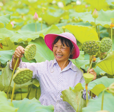 File photo shows a woman collecting lotus seedpods in Xinjian village, Jianfeng township, Guangchang county, east China's Jiangxi Province. (Photo/Zeng Henggui)