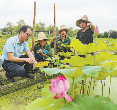 File photo shows a technician from the White Lotus Research Institute in Guangchang county, east China's Jiangxi Province, guiding lotus farmers in Xiaogang village, Xujiang township. (People's Daily/Zhu Lei)