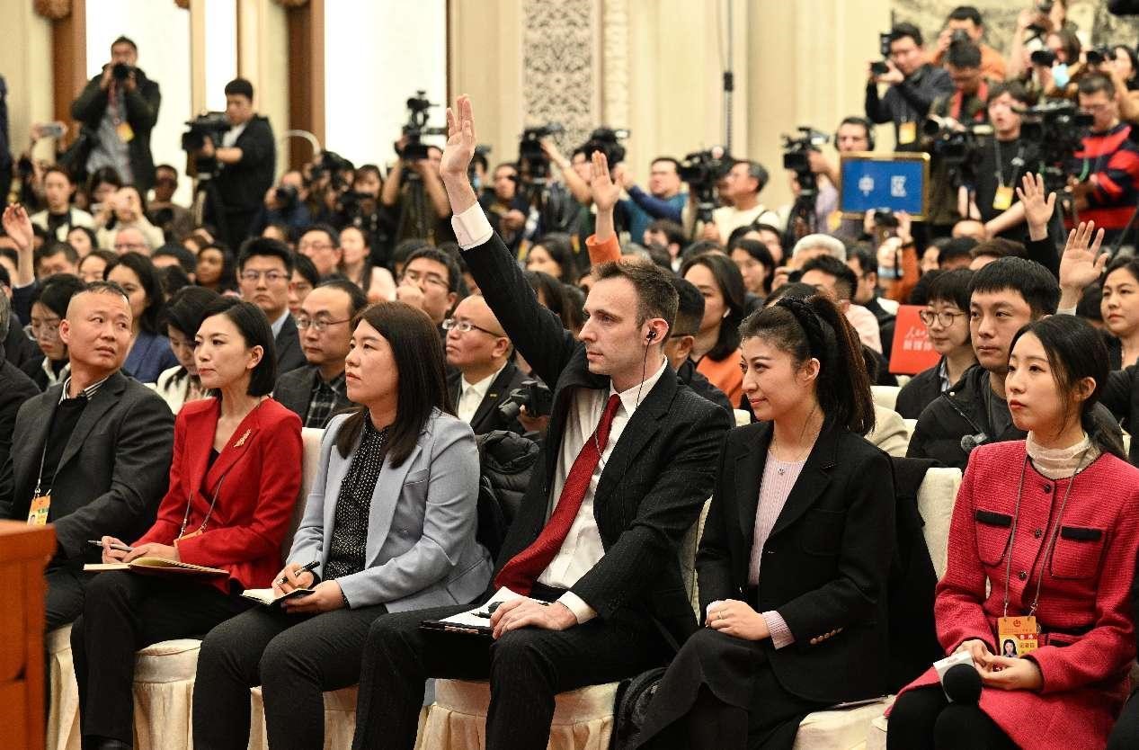 Chinese and foreign journalists raise their hands to ask questions at a press conference of the second session of the 14th National Committee of the Chinese People's Political Consultative Conference, March 3, 2024. (People's Daily/Lei Sheng)