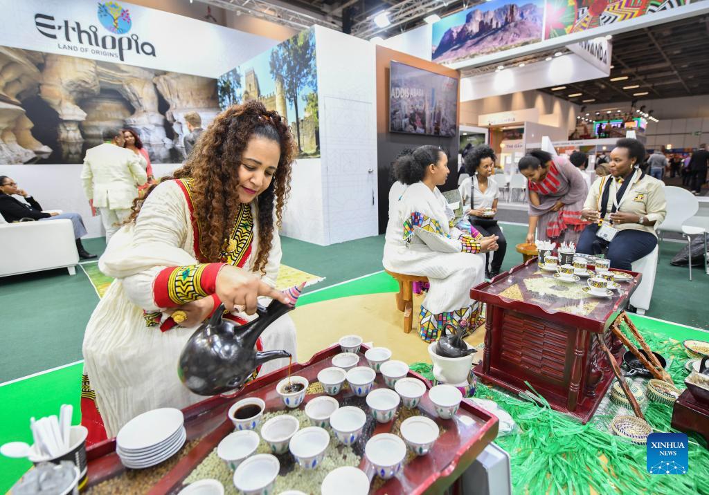 A staff member serves coffee at the booth of Ethiopia during the ITB Berlin travel trade show in Berlin, Germany, March 5, 2024. The ITB Berlin travel trade show kicked off here on Tuesday and will last until March 7. (Xinhua/Ren Pengfei)