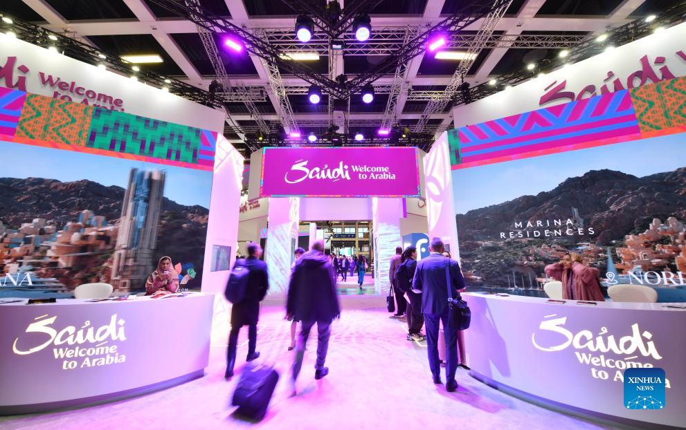 People walk past the booth of Saudi Arabia during the ITB Berlin travel trade show in Berlin, Germany, March 5, 2024. The ITB Berlin travel trade show kicked off here on Tuesday and will last until March 7. (Xinhua/Ren Pengfei)