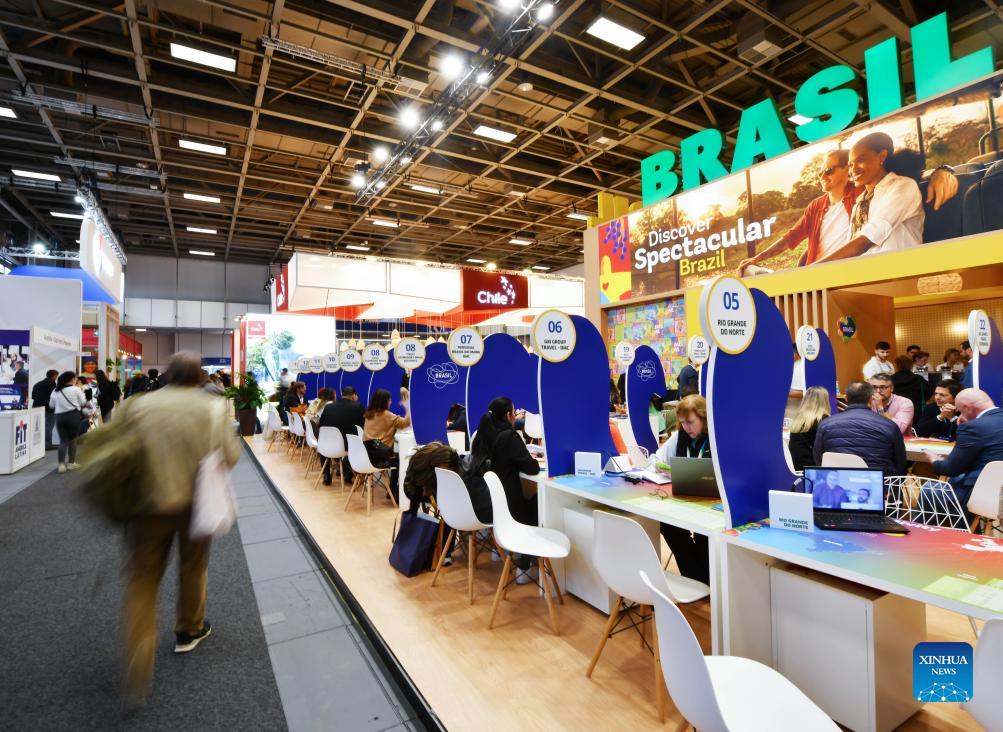 People communicate at the booth of Brazil during the ITB Berlin travel trade show in Berlin, Germany, March 5, 2024. The ITB Berlin travel trade show kicked off here on Tuesday and will last until March 7. (Xinhua/Ren Pengfei)