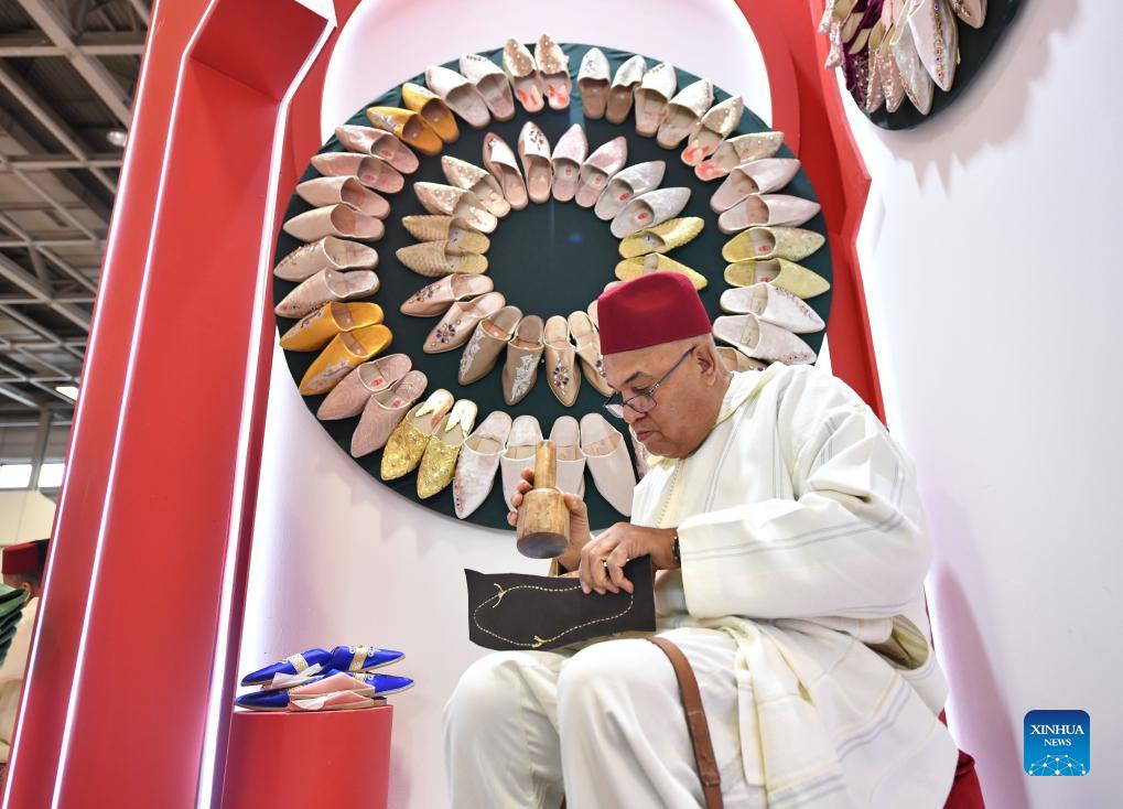 An artisan makes traditional Moroccan slippers at the booth of Morocco during the ITB Berlin travel trade show in Berlin, Germany, March 5, 2024. The ITB Berlin travel trade show kicked off here on Tuesday and will last until March 7. (Xinhua/Ren Pengfei)