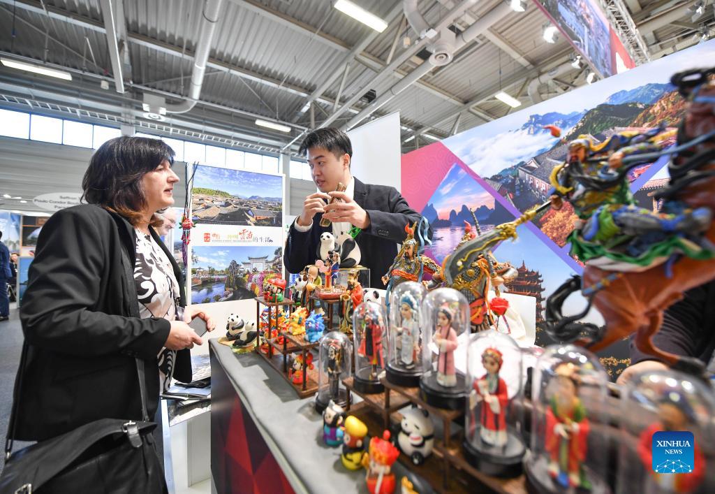 A staff member (R) introduces the crafts of dough modelling to a visitor at the booth of China during the ITB Berlin travel trade show in Berlin, Germany, March 5, 2024. The ITB Berlin travel trade show kicked off here on Tuesday and will last until March 7. (Xinhua/Ren Pengfei)