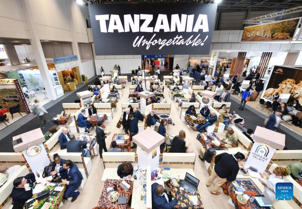 People communicate at the booth of Tanzania during the ITB Berlin travel trade show in Berlin, Germany, March 5, 2024. The ITB Berlin travel trade show kicked off here on Tuesday and will last until March 7. (Xinhua/Ren Pengfei)