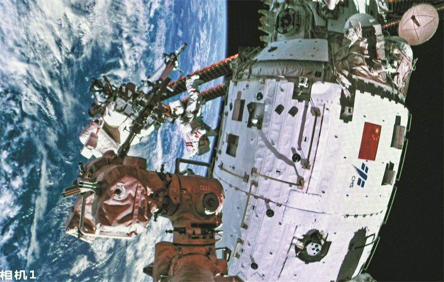 Shenzhou XVII mission commander Senior Colonel Tang Hongbo conducts an extravehicular mission outside the Tiangong space station on Saturday. [Photo/Xinhua]