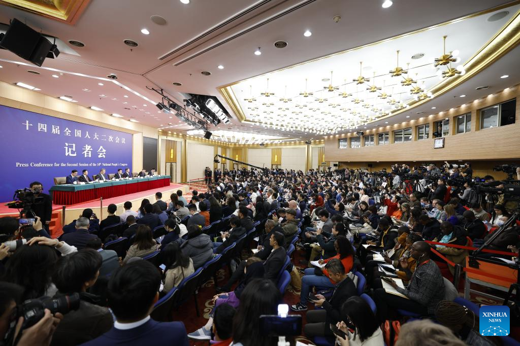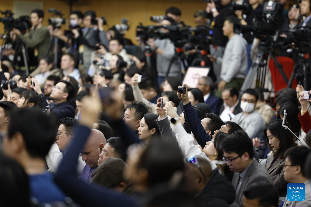 Journalists work at a press conference on economy for the second session of the 14th National People's Congress (NPC) in Beijing, capital of China, March 6, 2024. Zheng Shanjie, director of the National Development and Reform Commission, Lan Fo'an, minister of finance, Wang Wentao, minister of commerce, Pan Gongsheng, governor of the People's Bank of China, and Wu Qing, chairman of the China Securities Regulatory Commission, attended the press conference on Wednesday. (Xinhua/Fei Maohua)
