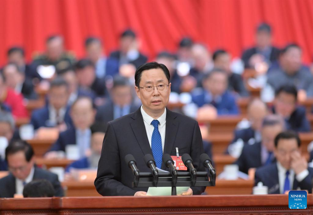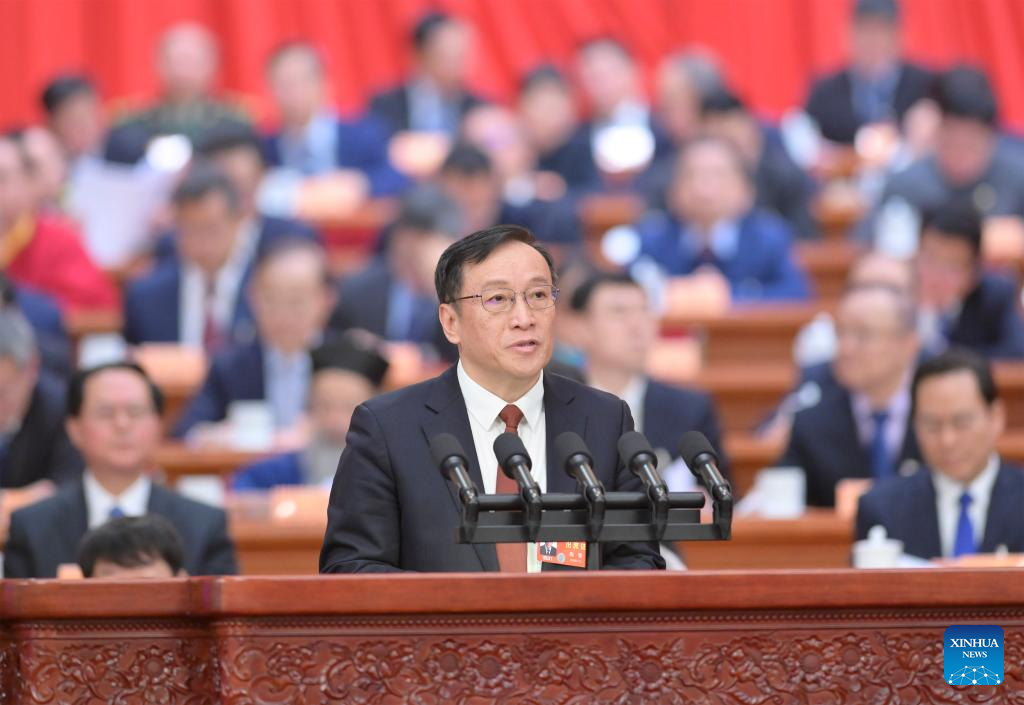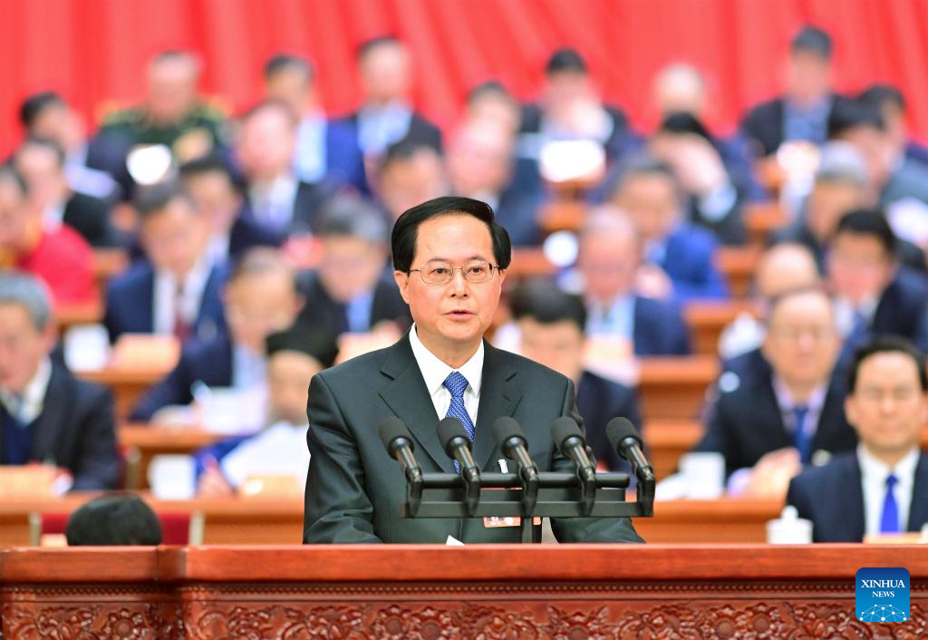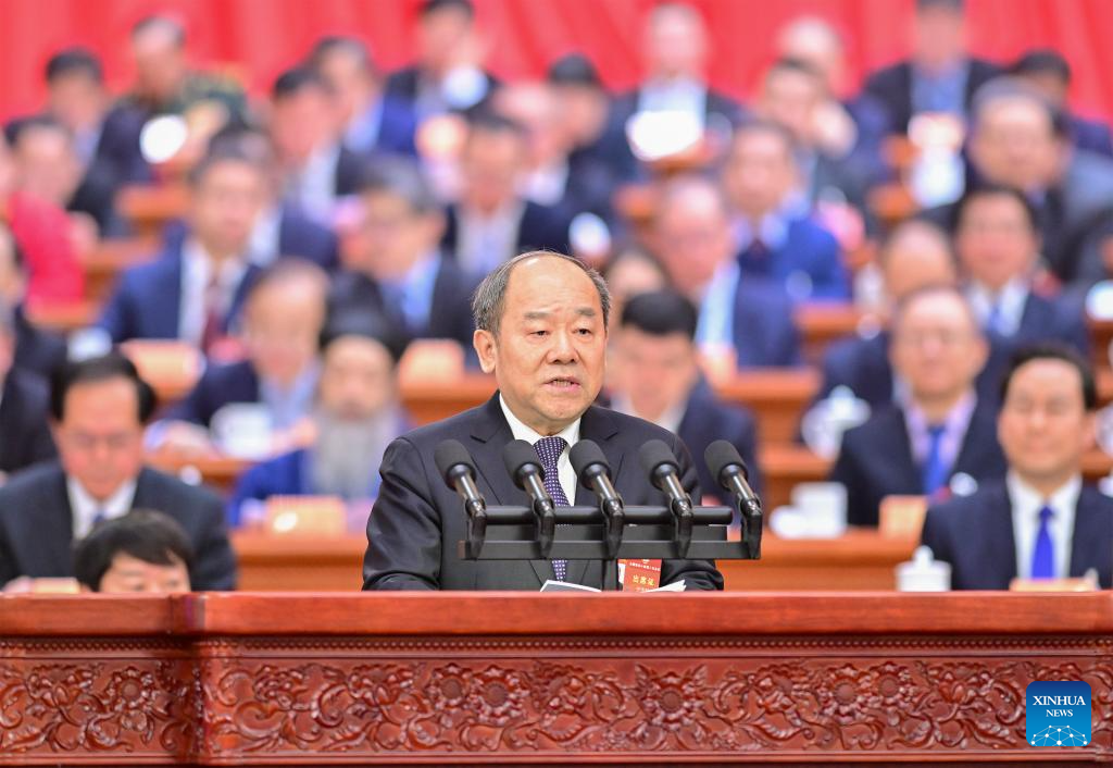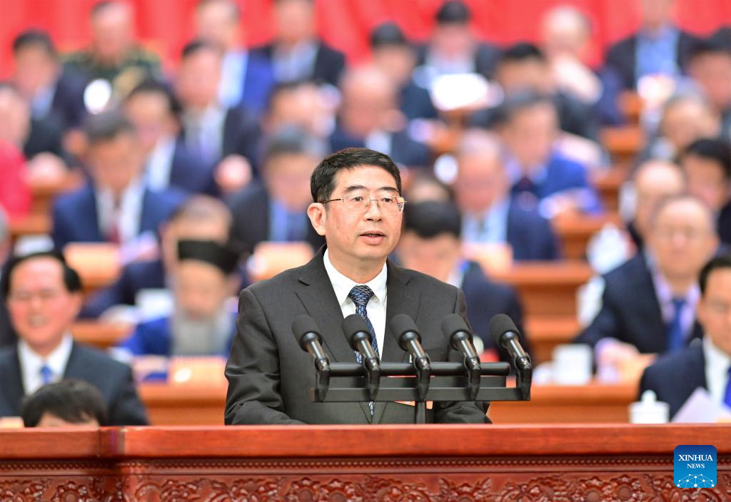 Ning Jizhe, a member of the 14th National Committee of the Chinese People's Political Consultative Conference (CPPCC), speaks at the second plenary meeting of the second session of the 14th CPPCC National Committee at the Great Hall of the People in Beijing, capital of China, March 7, 2024. (Xinhua/Zhai Jianlan)