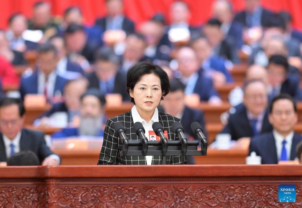 Wang Lu, a member of the 14th National Committee of the Chinese People's Political Consultative Conference (CPPCC), speaks at the second plenary meeting of the second session of the 14th CPPCC National Committee at the Great Hall of the People in Beijing, capital of China, March 7, 2024. (Xinhua/Zhai Jianlan)