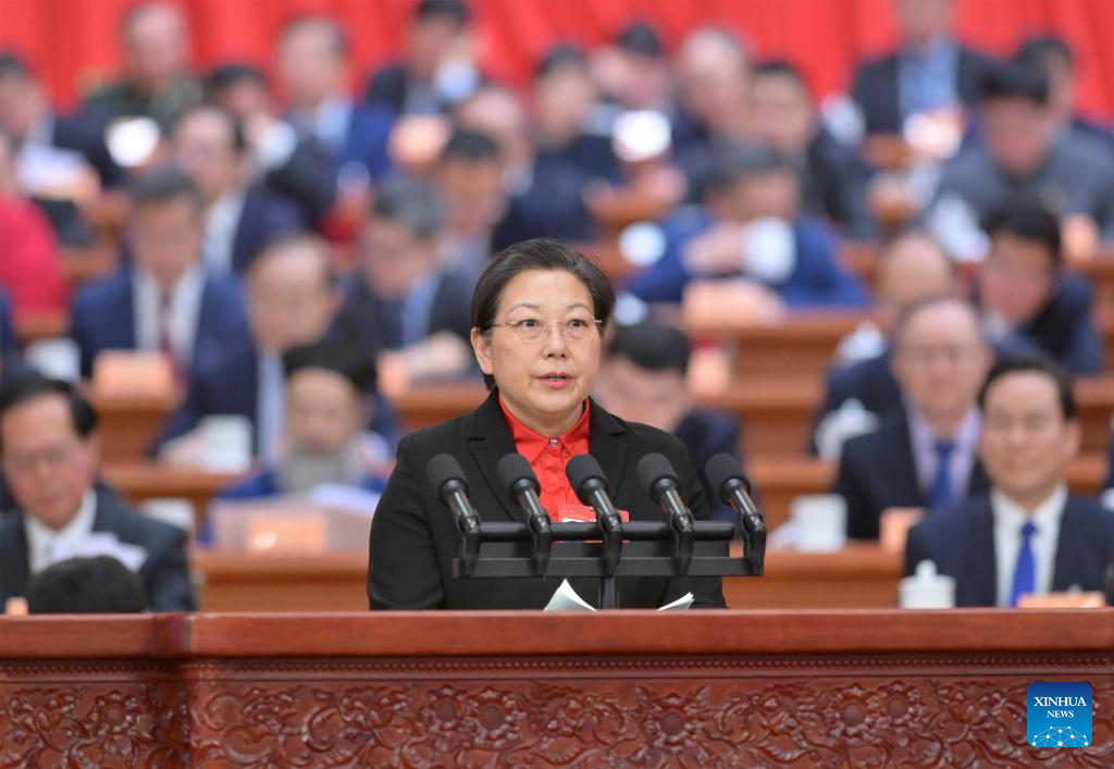 Xu Xiaolan, a member of the 14th National Committee of the Chinese People's Political Consultative Conference (CPPCC), speaks at the second plenary meeting of the second session of the 14th CPPCC National Committee at the Great Hall of the People in Beijing, capital of China, March 7, 2024. (Xinhua/Gao Jie)