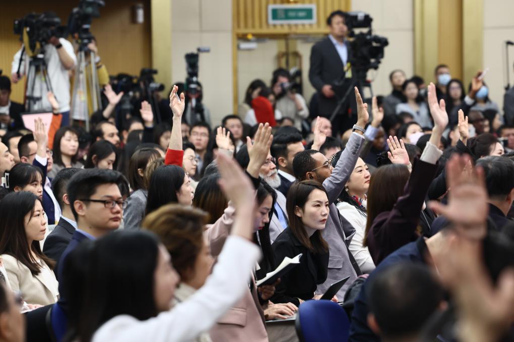 Journalists raise hands to ask questions at a press conference on the sidelines of the second session of the 14th National People's Congress (NPC) in Beijing, capital of China, March 7, 2024. Chinese Foreign Minister Wang Yi, also a member of the Political Bureau of the Communist Party of China Central Committee, answered questions of journalists from home and abroad on China's foreign policy and foreign relations during the press conference on Thursday. (Xinhua/Liu Xu)