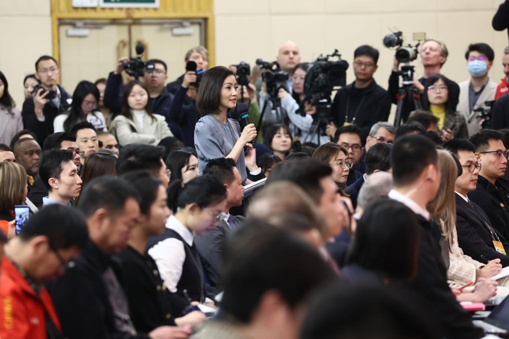 A journalist with Xinhua News Agency raises a question at a press conference on the sidelines of the second session of the 14th National People's Congress (NPC) in Beijing, capital of China, March 7, 2024. Chinese Foreign Minister Wang Yi, also a member of the Political Bureau of the Communist Party of China Central Committee, answered questions of journalists from home and abroad on China's foreign policy and foreign relations during the press conference on Thursday. (Xinhua/Liu Xu)