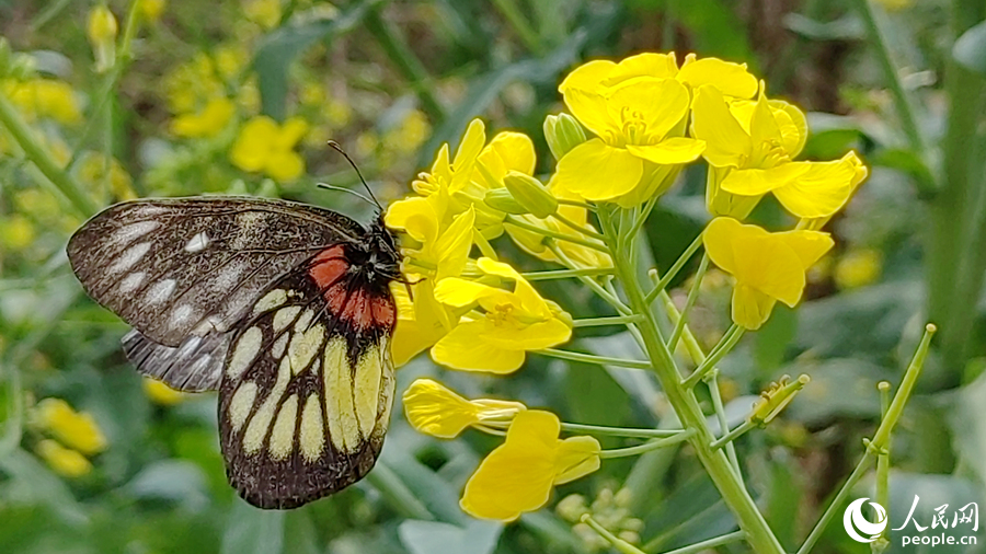 A butterfly sits on a rapeseed flower in Xiamen city, southeast China's Fujian Province. (People's Daily Online/Chen Bo)