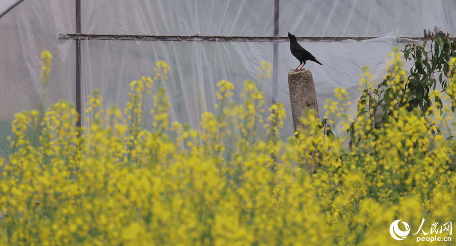 A bird stands on a stone pillar near a rapeseed field in Xiamen city, southeast China's Fujian Province. (People's Daily Online/Chen Bo)