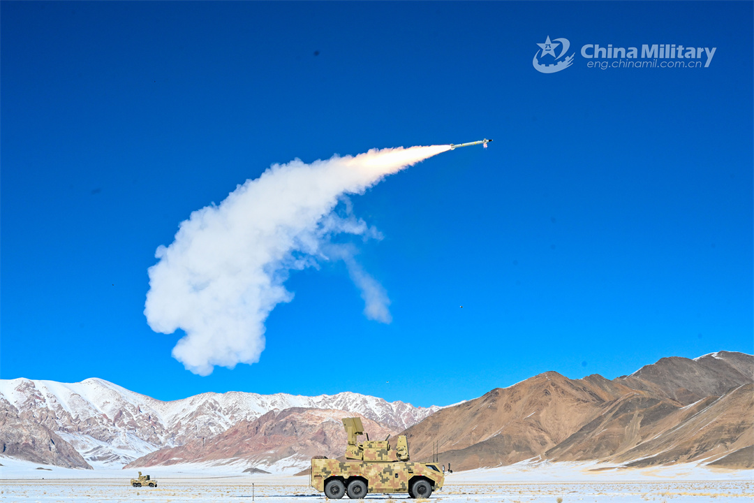 A missile launcher attached to a regiment of the PLA Xinjiang Military Command fires a surface-to-air missile at the mock target during a training exercise on February 17, 2024. (eng.chinamil.com.cn/Photo by Sun Lang)