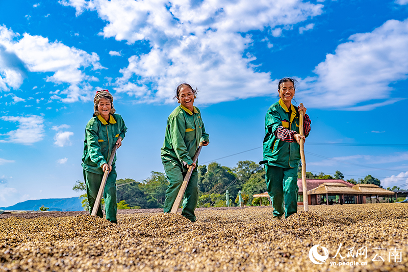 Farmers dry coffee beans under the sun in Fuyan township, Menglian county, southwest China's Yunnan Province, Jan. 16, 2024. (People's Daily Online/Hu Zunhui)