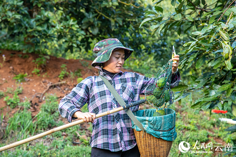 A villager picks avocados. (People's Daily Online/Hu Zunhui)