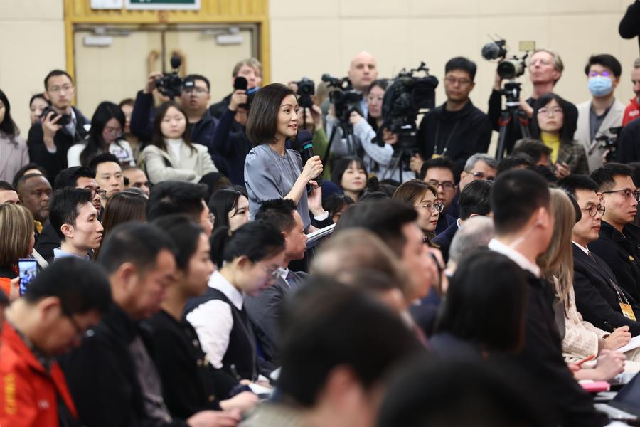 A journalist with Xinhua News Agency raises a question at a press conference on the sidelines of the second session of the 14th National People's Congress (NPC) in Beijing, capital of China, March 7, 2024. (Xinhua/Liu Xu)
