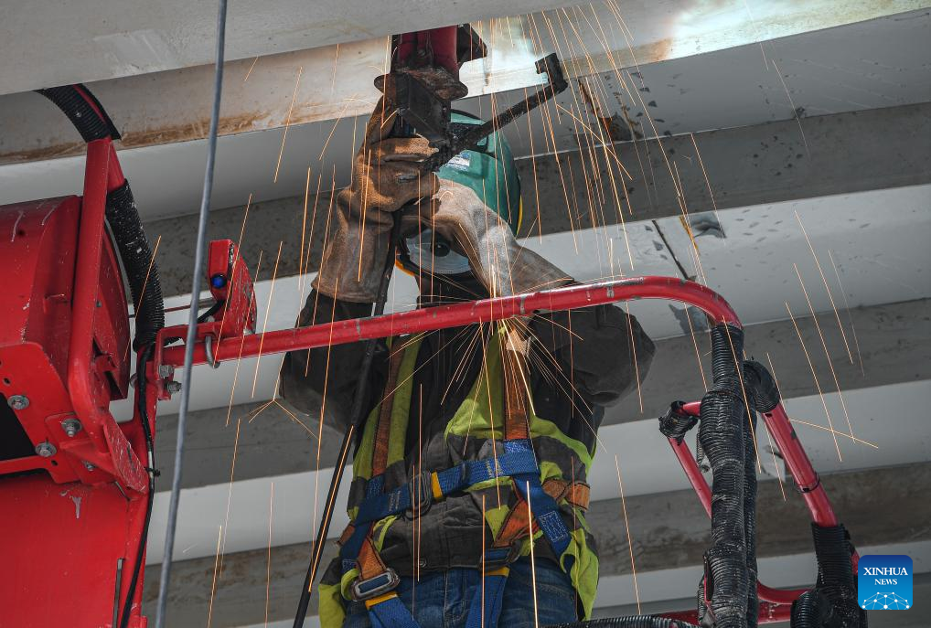 A worker works at the construction site of the Hainan commercial spacecraft launch site in Wenchang, south China's Hainan Province, March 6, 2024. Construction of the Hainan commercial spacecraft launch site is still underway. While the No. 1 launch pad was completed and in a debug phase, the No. 2 launch pad is still at the construction phase, with the capping of the diversion trough's main body finished. (Xinhua/Pu Xiaoxu)