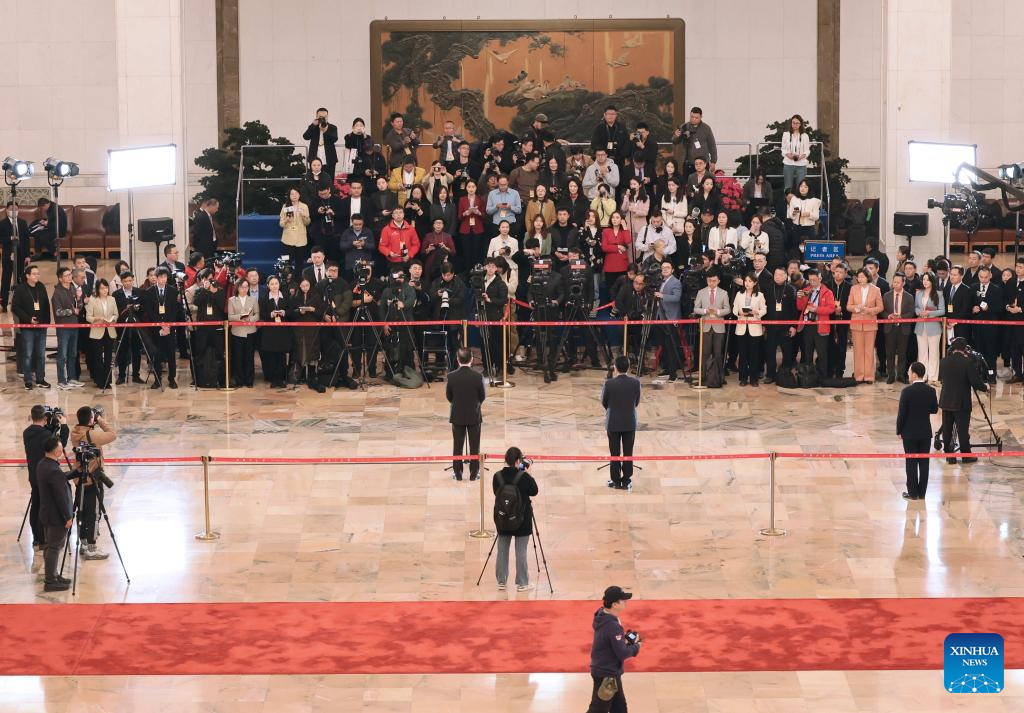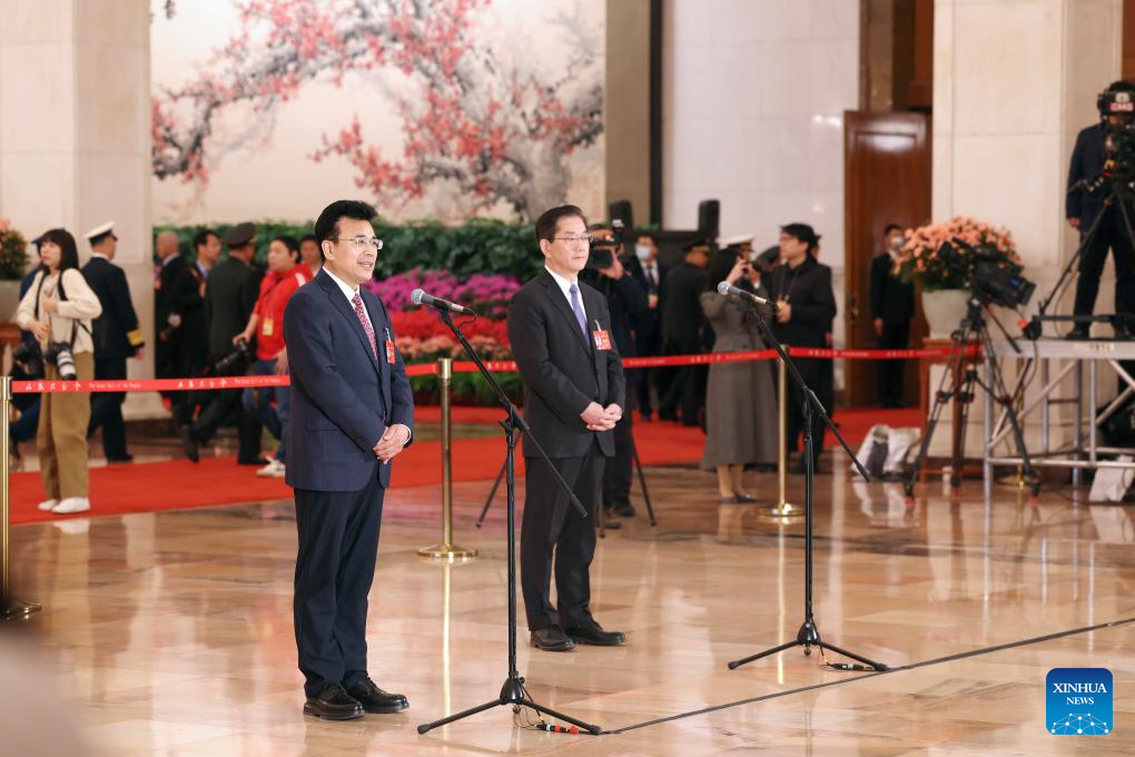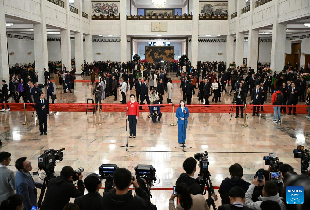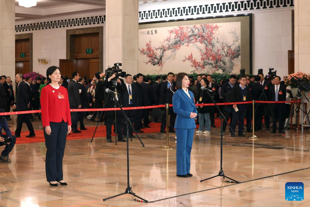 Deputies to the 14th National People's Congress (NPC) are interviewed ahead of the second plenary meeting of the second session of the 14th NPC at the Great Hall of the People in Beijing, capital of China, March 8, 2024. (Xinhua/Wang Jingqiang)