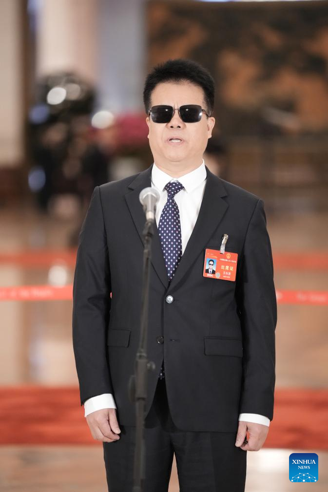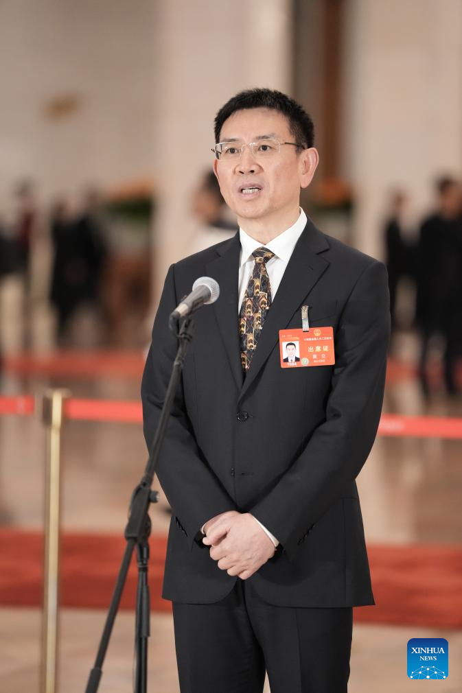 Chen Jun, a deputy to the 14th National People's Congress (NPC), is interviewed ahead of the second plenary meeting of the second session of the 14th NPC at the Great Hall of the People in Beijing, capital of China, March 8, 2024. (Xinhua/Wang Yuguo)