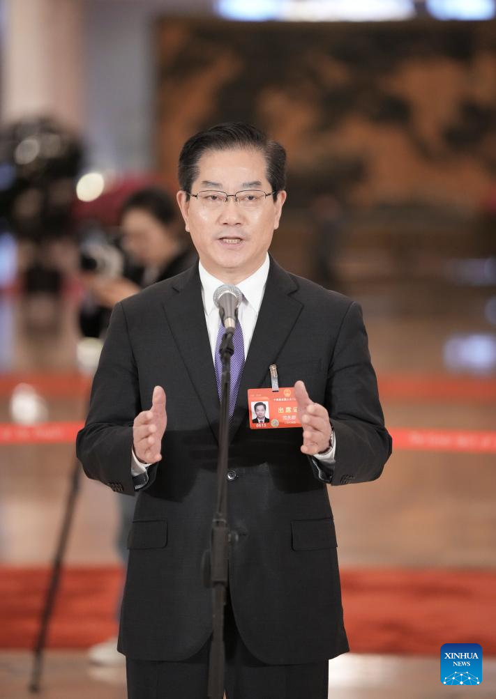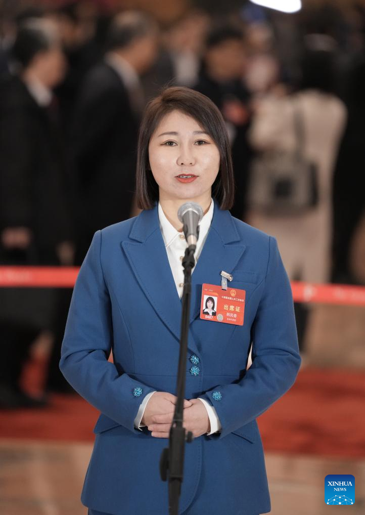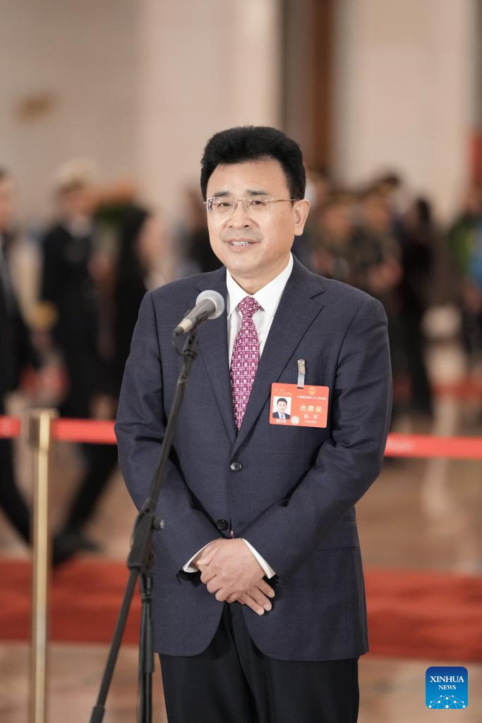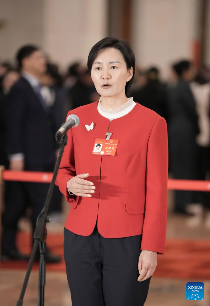 Fan Xianqun, a deputy to the 14th National People's Congress (NPC), is interviewed ahead of the second plenary meeting of the second session of the 14th NPC at the Great Hall of the People in Beijing, capital of China, March 8, 2024. (Xinhua/Wang Yuguo)