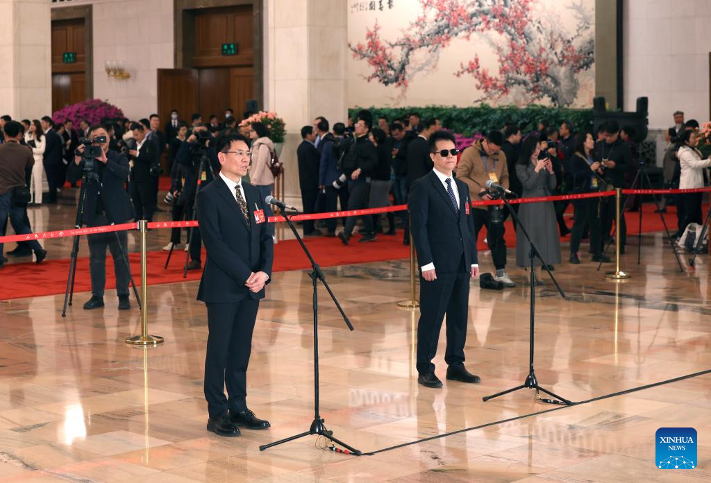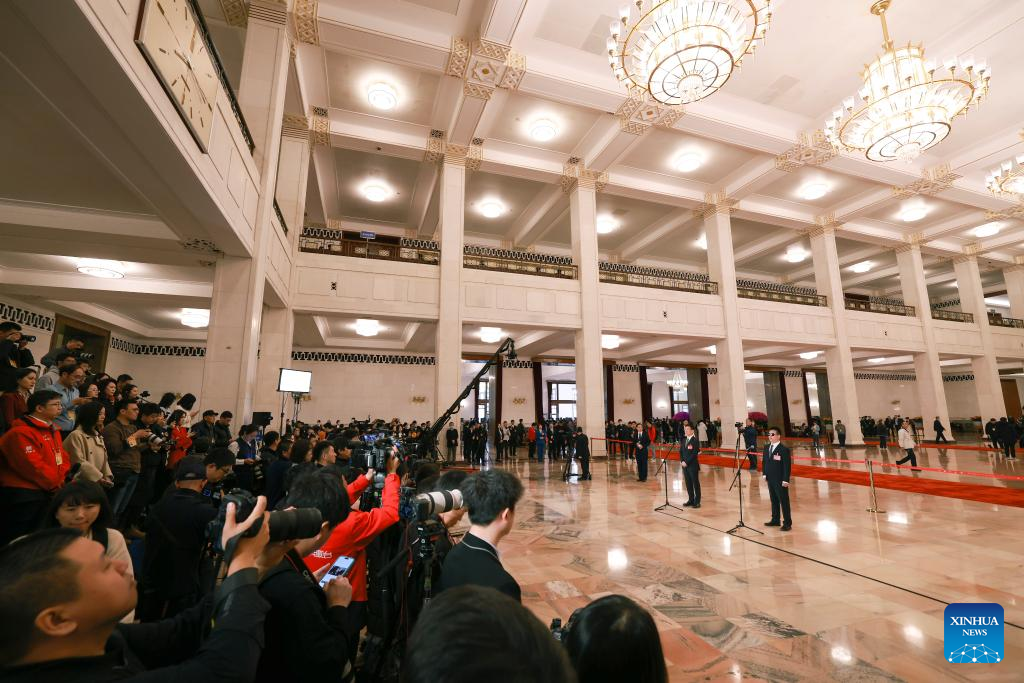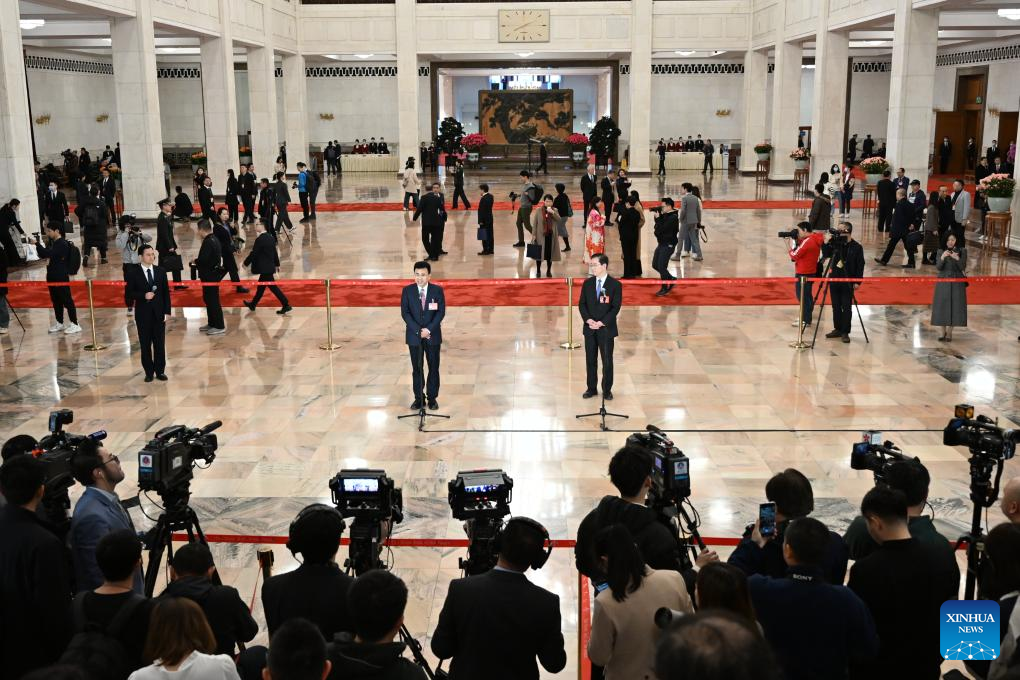 Deputies to the 14th National People's Congress (NPC) are interviewed ahead of the second plenary meeting of the second session of the 14th NPC at the Great Hall of the People in Beijing, capital of China, March 8, 2024. (Xinhua/Liu Xu)