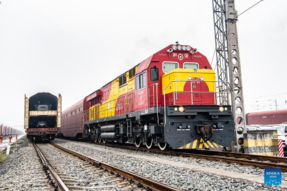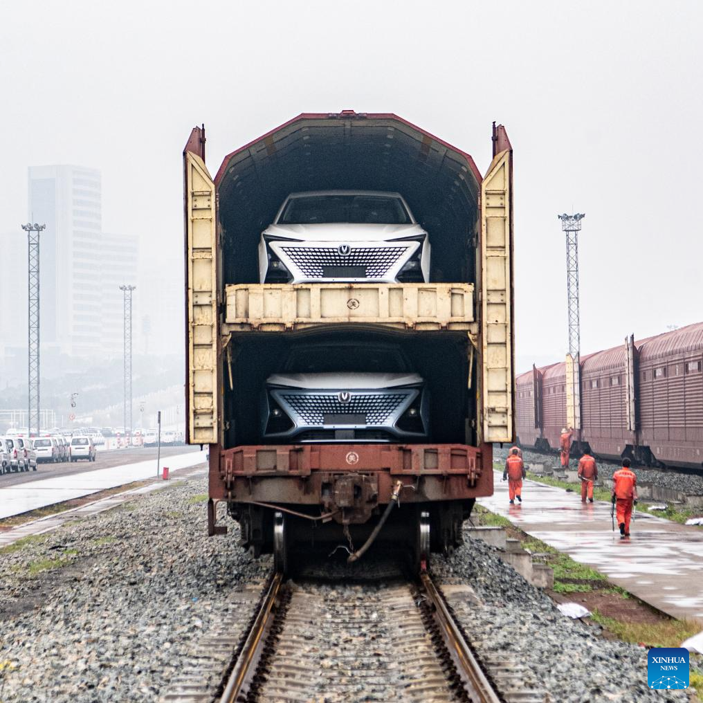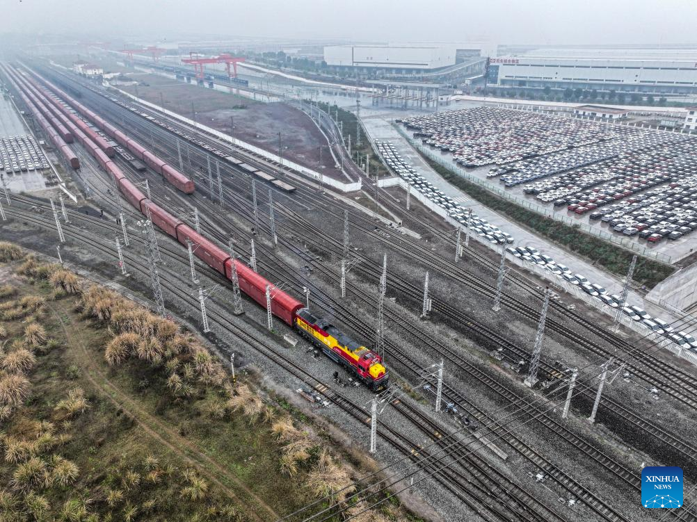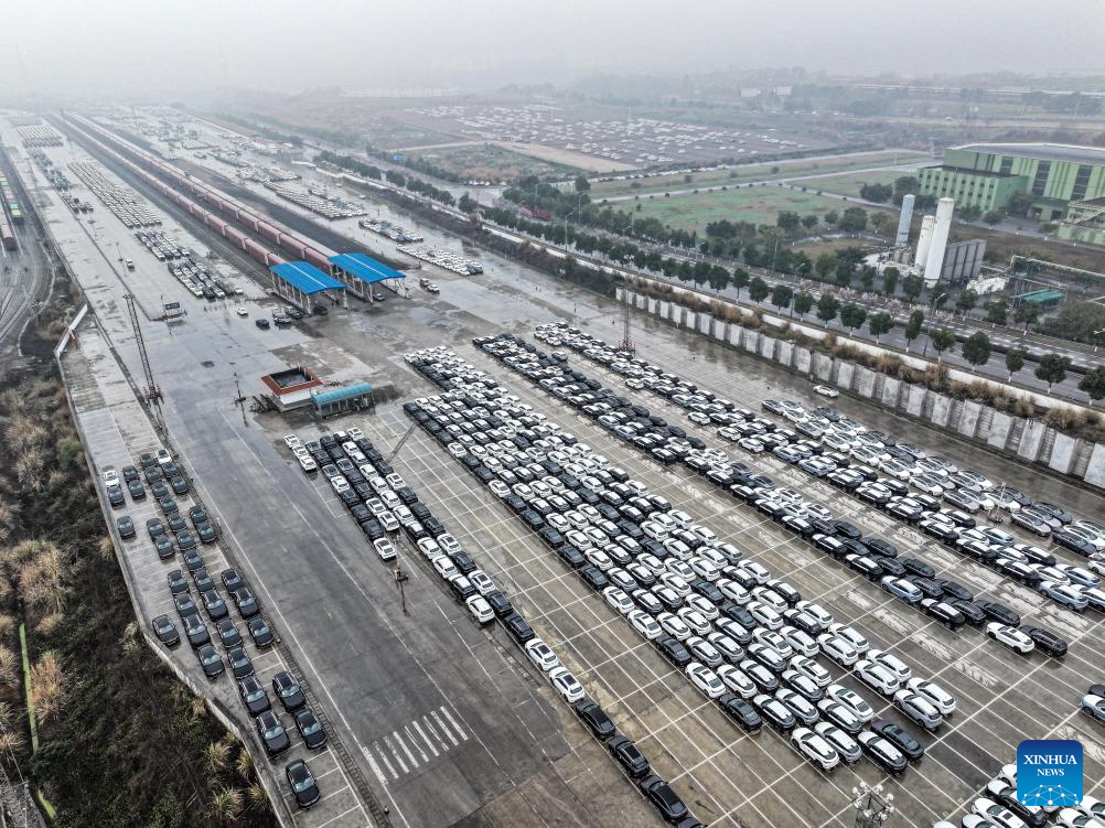 Finished vehicles wait to be exported via China-Europe freight trains at Yuzui Station in Jiangbei District of southwest China's Chongqing Municipality, March 6, 2024. In 2023, more than 110,000 finished vehicles have been exported via the China-Europe freight trains departing from Chongqing. Meanwhile, the city also witnessed a significant growth in finished car imports via the China-Europe freight train service. (Xinhua/Tang Yi)