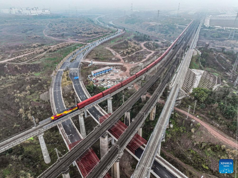 An aerial drone photo shows a China-Europe freight train loaded with finished vehicles for export pulling out of the Yuzui Station in southwest China's Chongqing Municipality, March 6, 2024. In 2023, more than 110,000 finished vehicles have been exported via the China-Europe freight trains departing from Chongqing. Meanwhile, the city also witnessed a significant growth in finished car imports via the China-Europe freight train service. (Xinhua/Tang Yi)