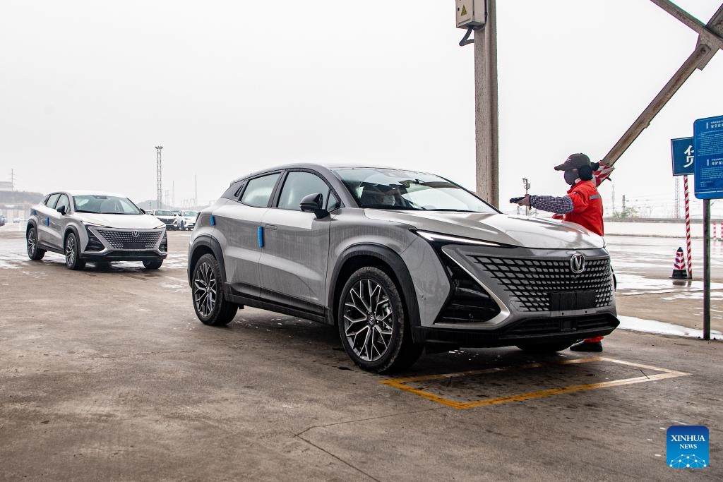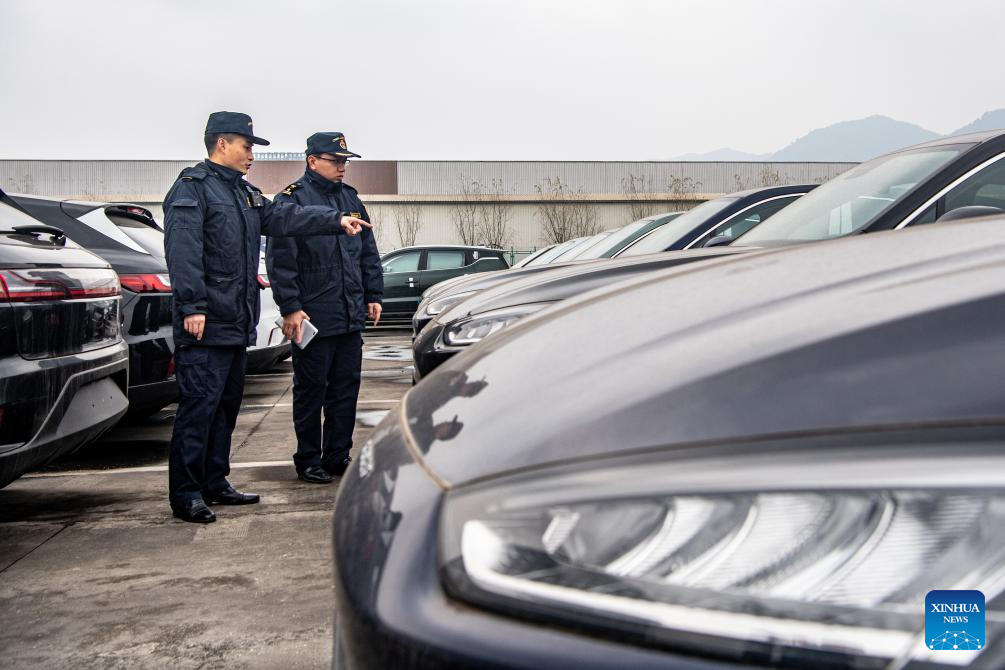 Customs officers check finished vehicles waiting to be exported via China-Europe freight trains at the Chongqing Railway Port in Shapingba District of southwest China's Chongqing Municipality, March 6, 2024. In 2023, more than 110,000 finished vehicles have been exported via the China-Europe freight trains departing from Chongqing. Meanwhile, the city also witnessed a significant growth in finished car imports via the China-Europe freight train service. (Xinhua/Tang Yi)