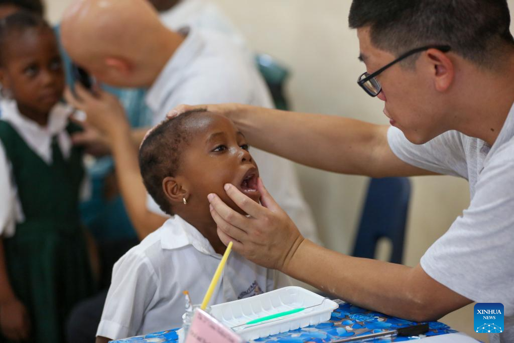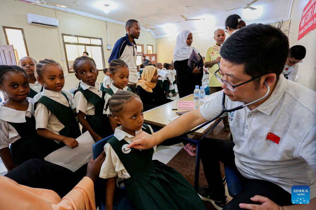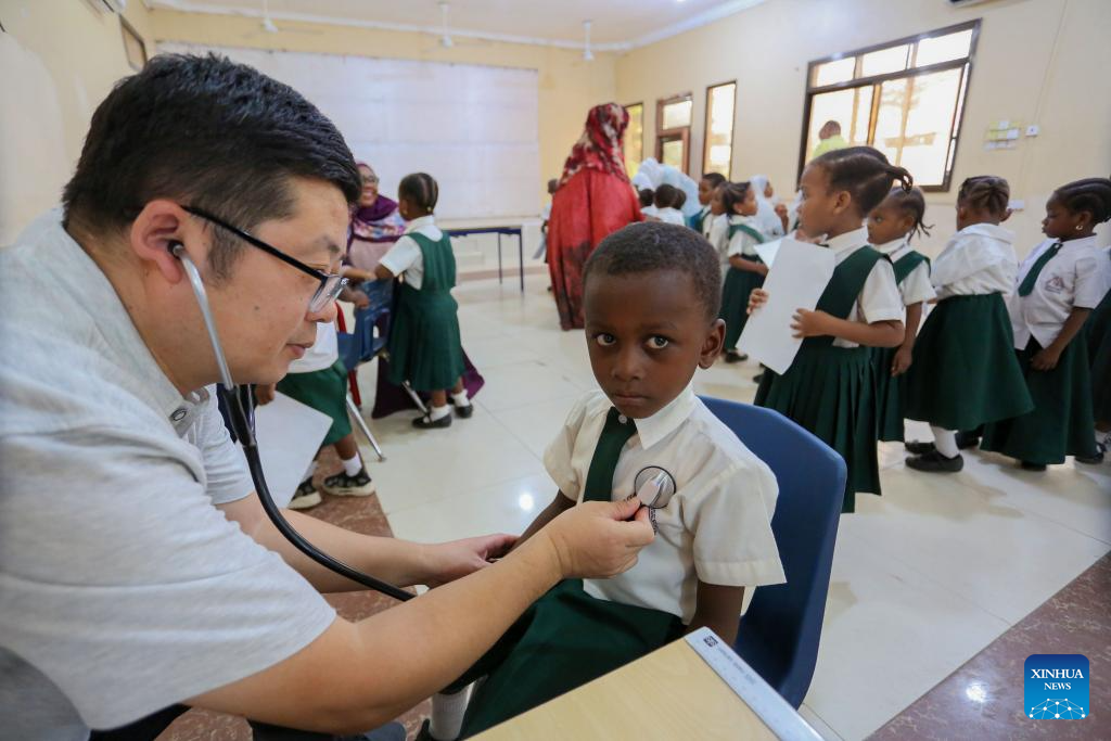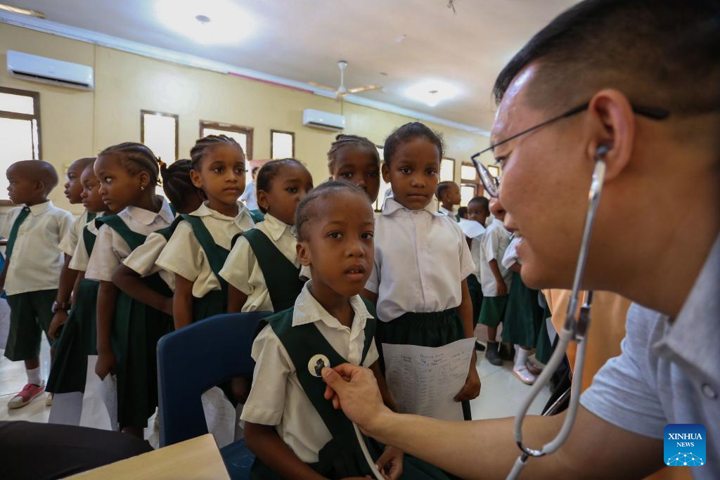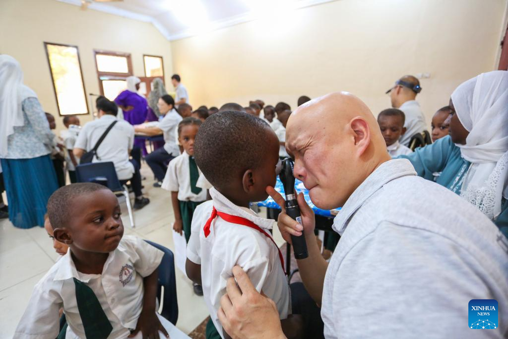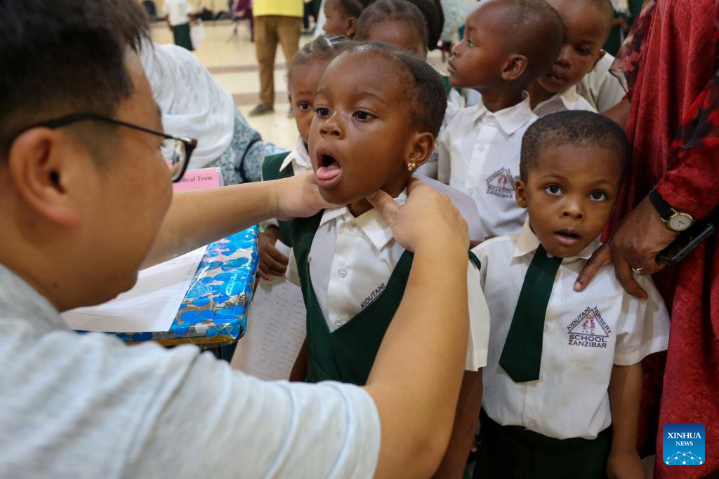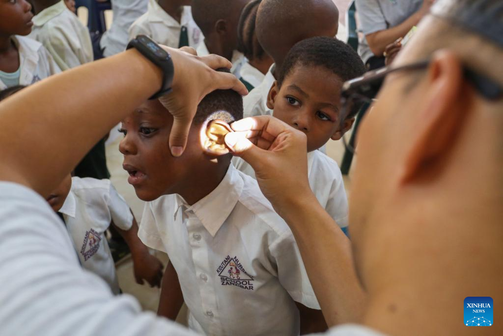 Members of the 33rd batch of the Chinese medical team in Zanzibar give free medical examination to children at a nursery school in Zanzibar, Tanzania, on March 6, 2024. (Photo by Herman Emmanuel/Xinhua)