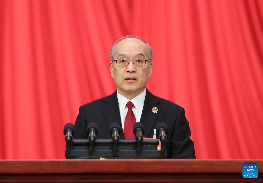 Zhang Jun, president of the Supreme People's Court (SPC), delivers a work report of the SPC at the second plenary meeting of the second session of the 14th National People's Congress (NPC) at the Great Hall of the People in Beijing, capital of China, March 8, 2024. (Xinhua/Liu Weibing)