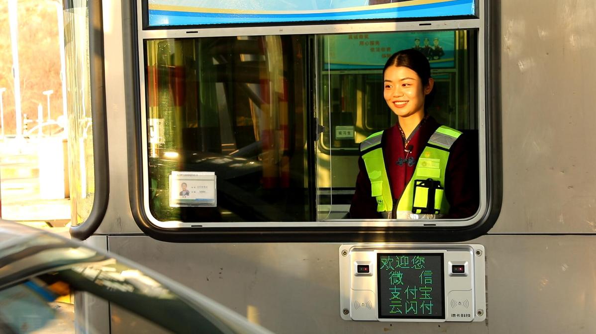 Yu leans out the window of her booth to take a toll card handed up by a driver. She states the toll sum, takes cash or guides a driver making a mobile payment. As she returns the invoice, she wishes every driver a happy journey and life.