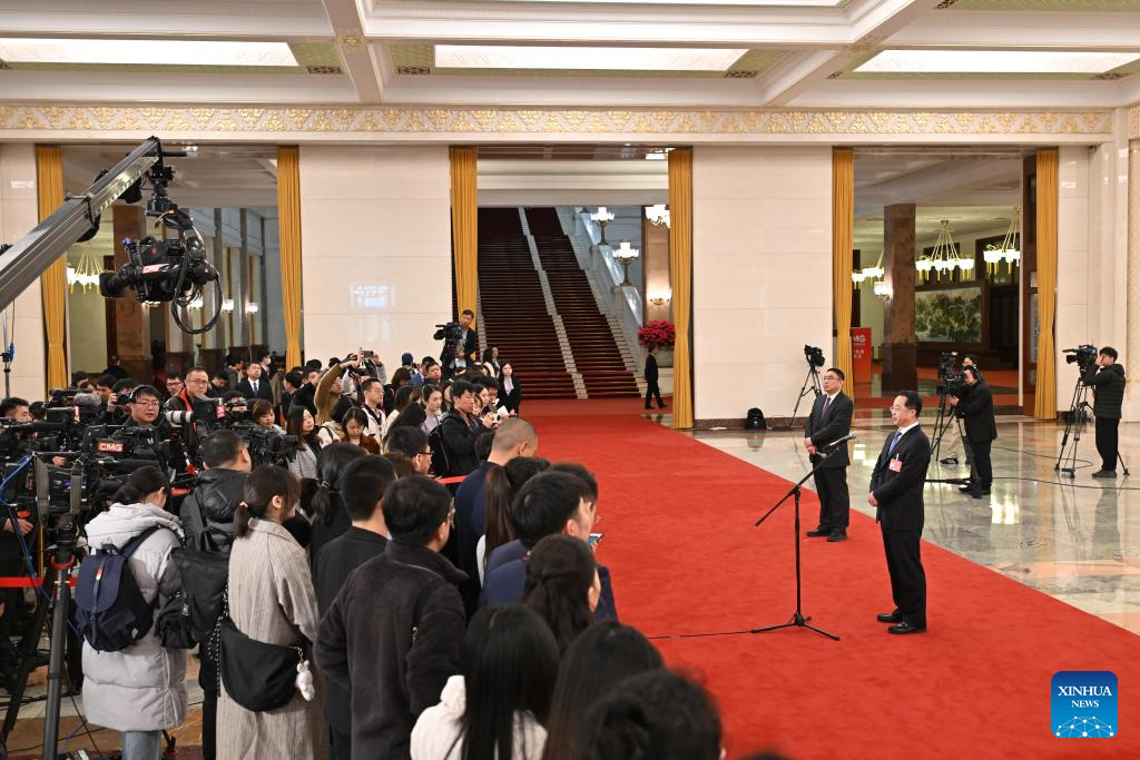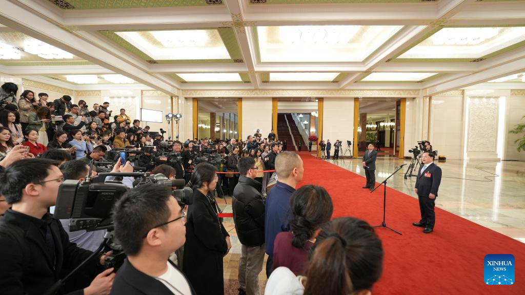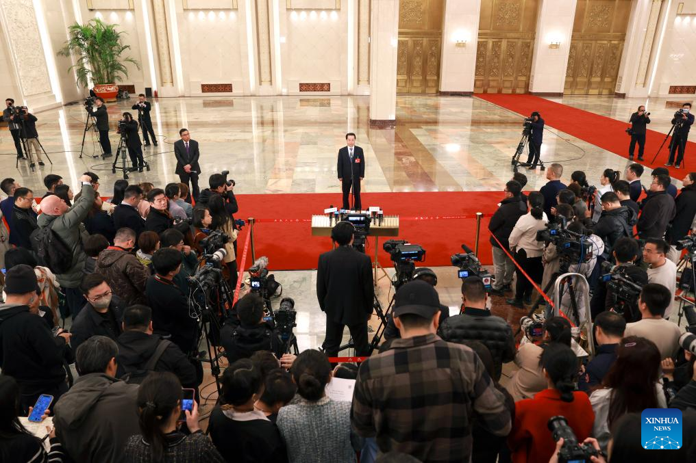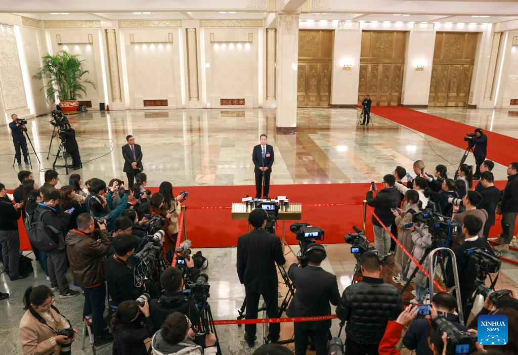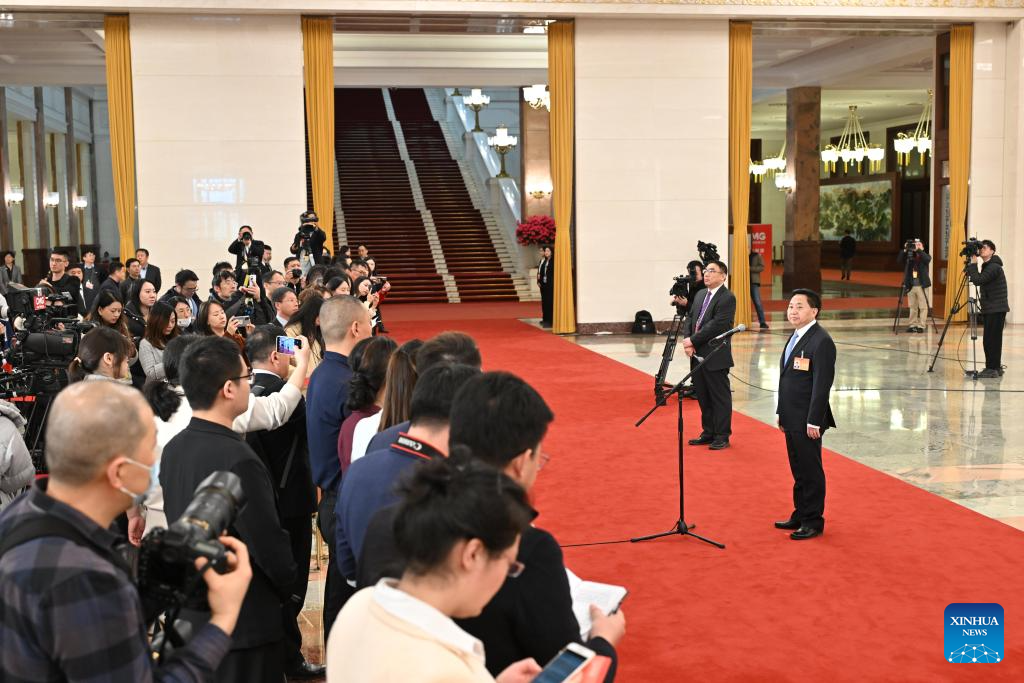 Chinese Minister of Transport Li Xiaopeng gives an interview after the second plenary meeting of the second session of the 14th National People's Congress (NPC) at the Great Hall of the People in Beijing, capital of China, March 8, 2024. (Xinhua/Li Xin)