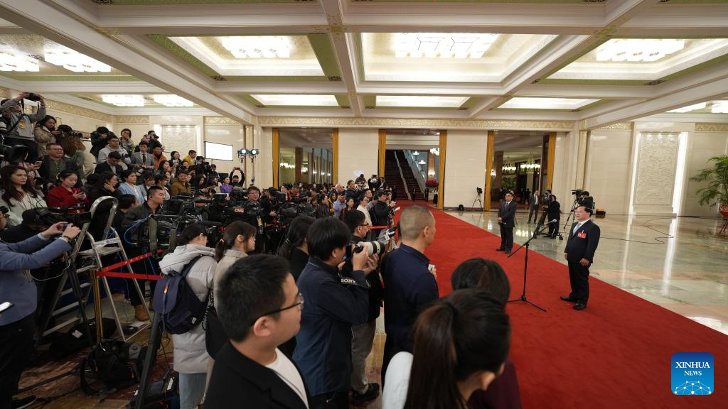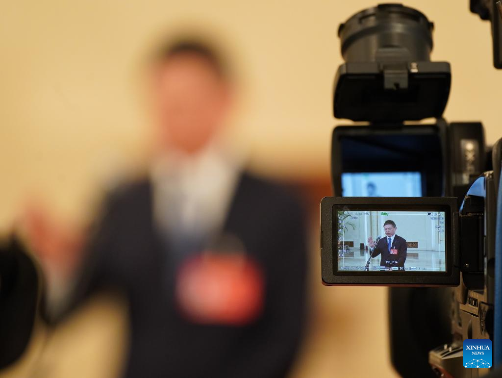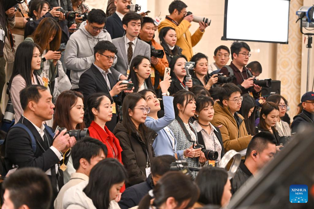 Journalists work during an interview of ministers after the second plenary meeting of the second session of the 14th National People's Congress (NPC) at the Great Hall of the People in Beijing, capital of China, March 8, 2024. (Xinhua/Li Xin)