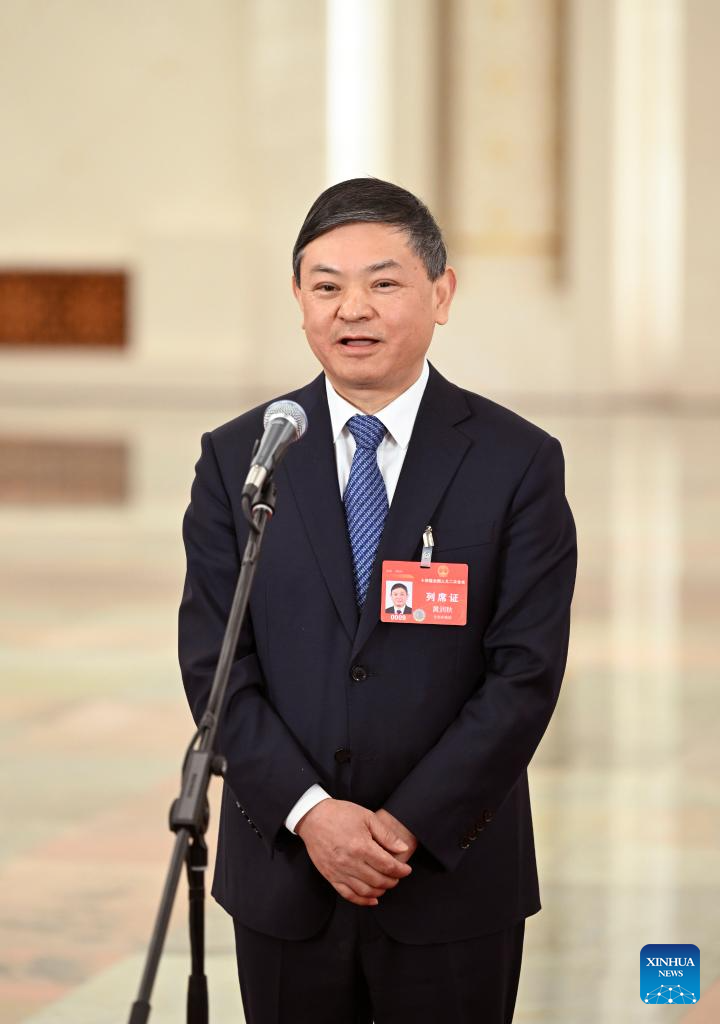 Chinese Minister of Ecology and Environment Huang Runqiu gives an interview after the second plenary meeting of the second session of the 14th National People's Congress (NPC) at the Great Hall of the People in Beijing, capital of China, March 8, 2024. (Xinhua/Wang Jianhua)