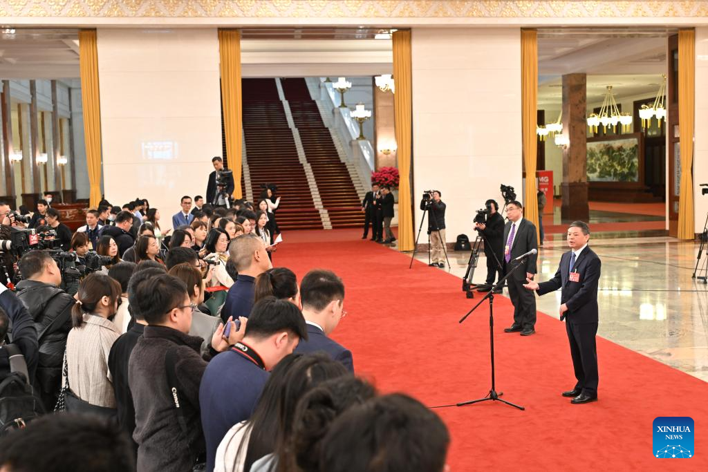 Chinese Minister of Civil Affairs Lu Zhiyuan gives an interview after the second plenary meeting of the second session of the 14th National People's Congress (NPC) at the Great Hall of the People in Beijing, capital of China, March 8, 2024. (Xinhua/Wang Jianhua)