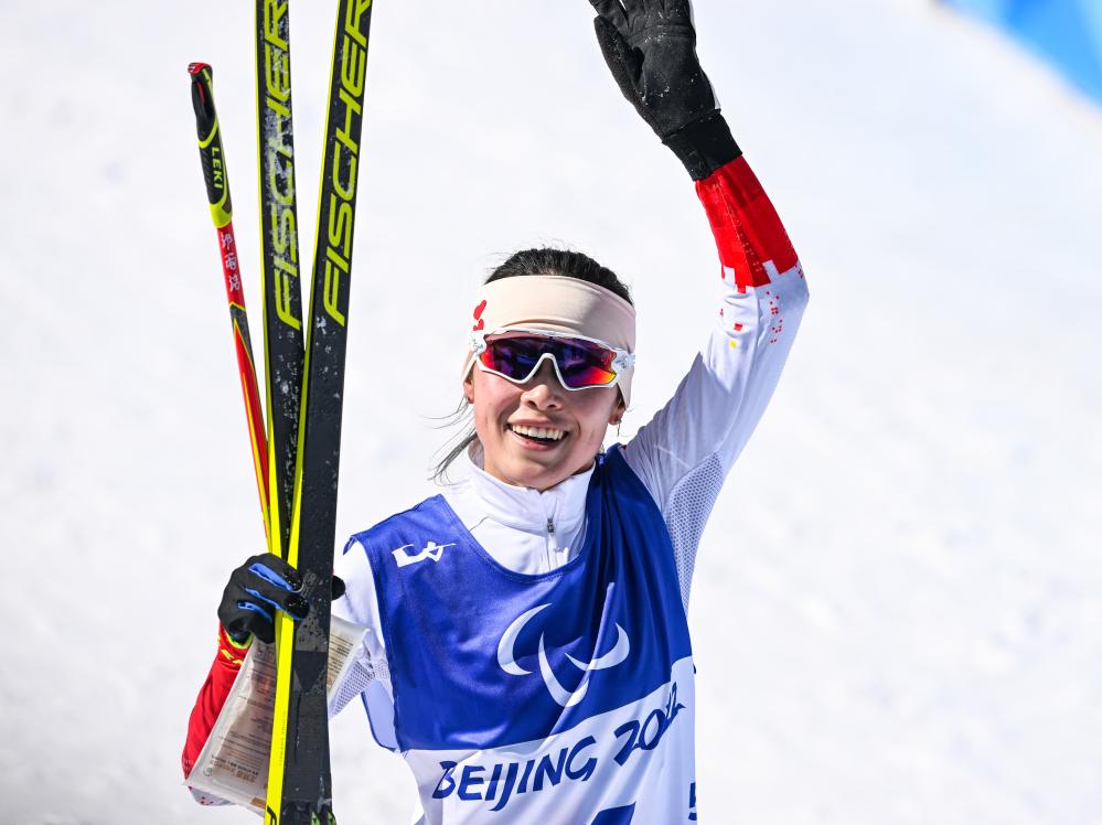 Guo Yujie of China gestures to the audience after the biathlon women's sprint standing event of Beijing 2022 Paralympic Winter Games at National Biathlon Centre in Zhangjiakou, north China's Hebei Province, March 5, 2022. (Xinhua/Wang Xi)