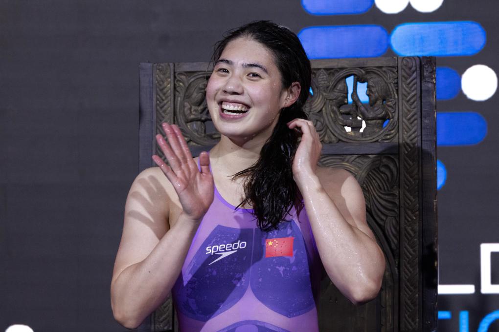 Zhang Yufei of China reacts after winning the women's 100m butterfly final at the World Aquatics Swimming World Cup in Budapest, Hungary on Oct. 22, 2023. (Photo by Attila Volgyi/Xinhua)