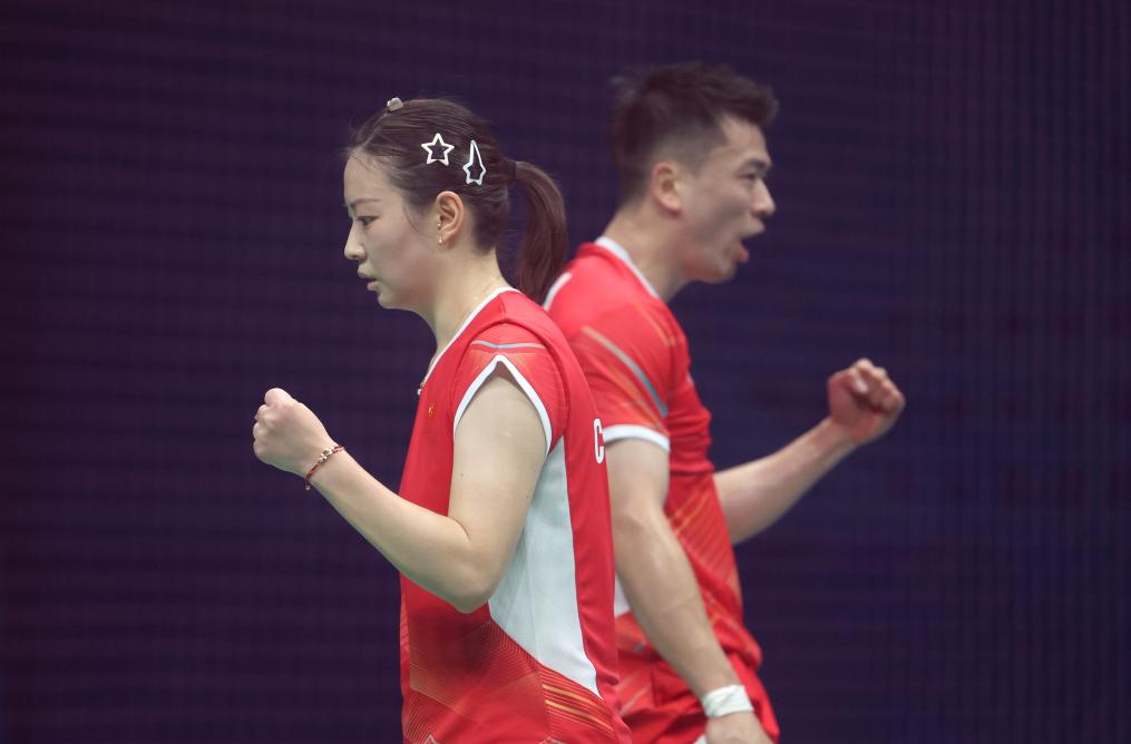 Zheng Siwei (rear)/Huang Yaqiong of China celebrate scoring during the mixed doubles gold medal match against Watanabe Yuta/Higashino Arisa of Japan at the 19th Asian Games in Hangzhou, east China's Zhejiang Province, Oct. 7, 2023. (Xinhua/Chen Bin)