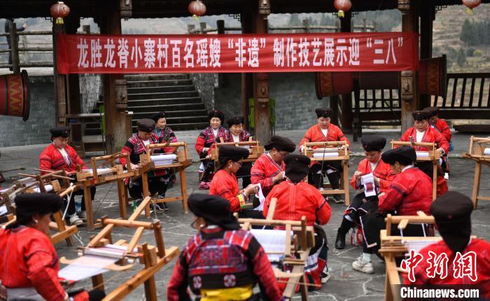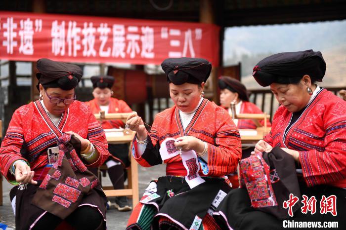 A hundred women of the Red Yao ethnic group gathered in festive attire to showcase their embroidery skills in Xiaozhai village, Longji township, Longsheng county, south China's Guangxi Zhuang Autonomous Region, on March 7, one day ahead of International Women's Day.
