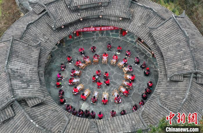 Photo taken by a drone shows women of the Red Yao ethnic group showcasing their embroidery skills in Xiaozhai village, Longji township, Longsheng county, Guilin city, south China's Guangxi Zhuang Autonomous Region, on March 7, 2024. (Photo/Pan Zhixiang)