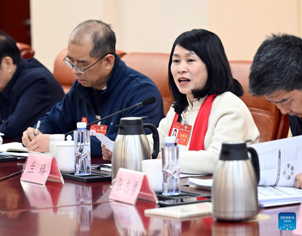 National political advisor Lan Zhen (2nd R) speaks at a group meeting at the second session of the 14th National Committee of the Chinese People's Political Consultative Conference (CPPCC) in Beijing, capital of China, March 5, 2024. (Xinhua/Chen Yehua)