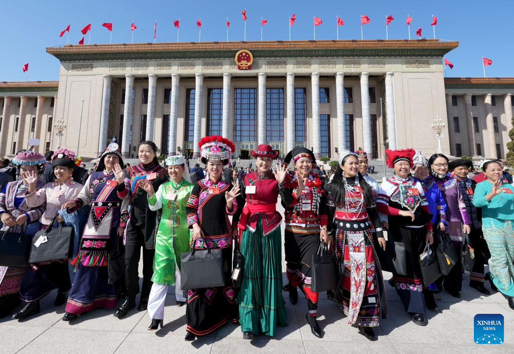 Deputies to the 14th National People's Congress (NPC) pose for photos in front of the Great Hall of the People after attending the second plenary meeting of the second session of the 14th NPC in Beijing, capital of China, March 8, 2024. (Xinhua/Wang Yuguo)