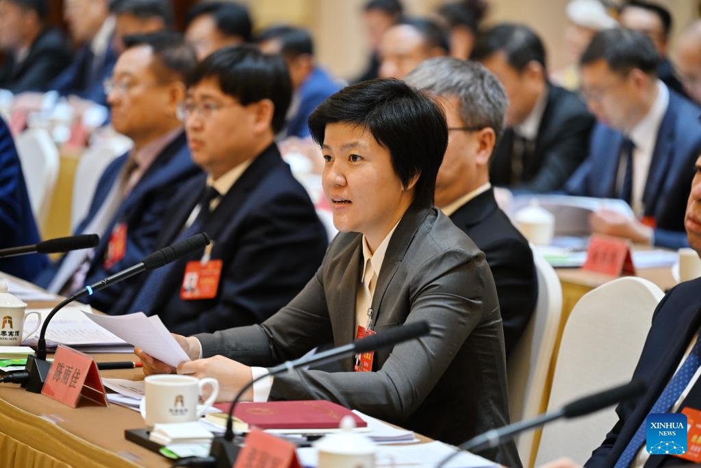 Chen Yujia, a deputy to the 14th National People's Congress (NPC), speaks at a plenary meeting of deputies from the delegation of Heilongjiang Province at the second session of the 14th NPC in Beijing, capital of China, March 7, 2024. (Xinhua/Mou Yu)