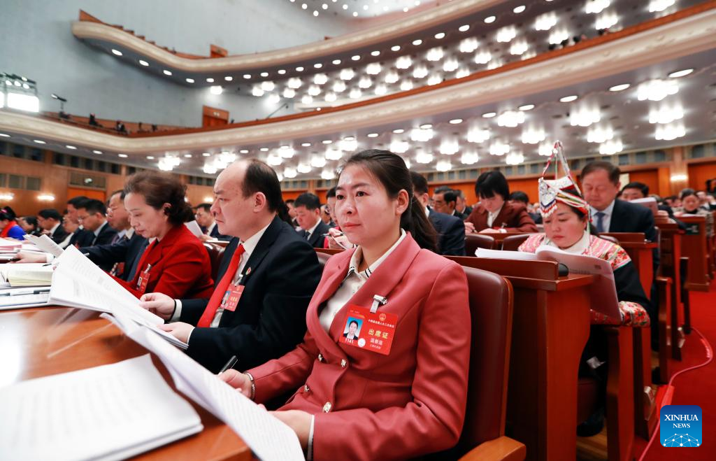 Wen Shanlian (1st R, front), a deputy to the 14th National People's Congress (NPC), attends the second plenary meeting of the second session of the 14th NPC in Beijing, capital of China, March 8, 2024. (Xinhua/Lu Ye)